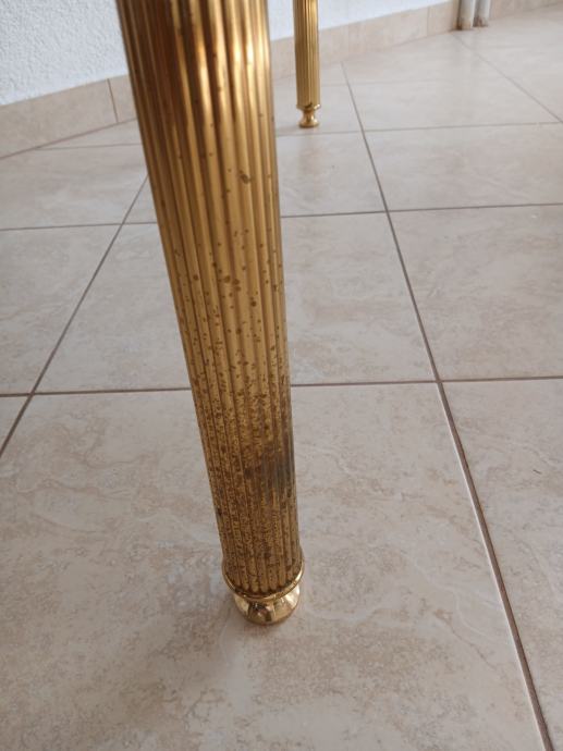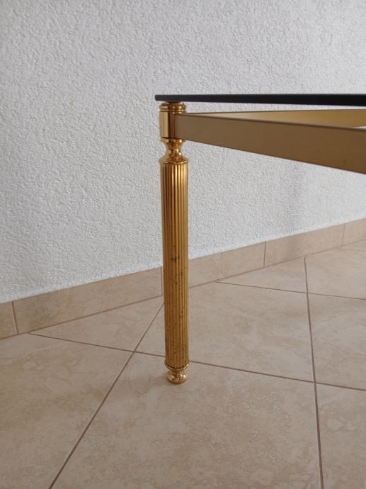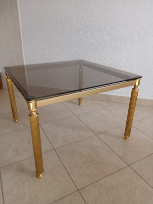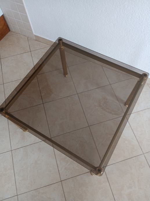Stolic od mesinga,sa staklenom pločom.Dimenzije 70×70×46 cm Staklo zatamnjeno debljina 8 mm.Neznatna oksidacija na dvije noge koja se može očistiti.