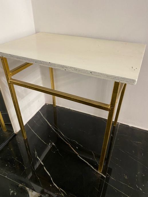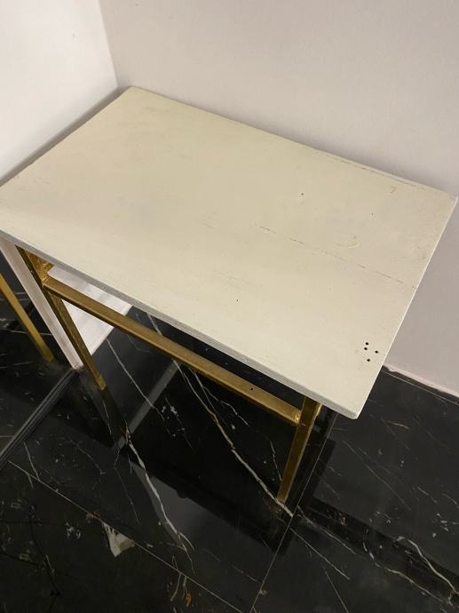 Stolic s drvenom plocom i metalnim zlatnim nogicama.