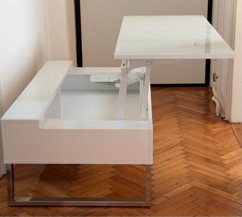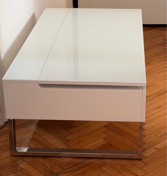 Prodajem stolić za dnevni boravak bijele boje s kromiranim metalnim nogama. Stolić ima praktičan mehanizam podizanja gornje ploče koja se može postaviti u višu poziciju, a ispod se nalazi prostor za odlaganje stvari. Ploča je u mat bijeloj završnoj obradi s staklenim umetkom. Modernog i čistog dizajna, dobro se uklapa u različite interijere.