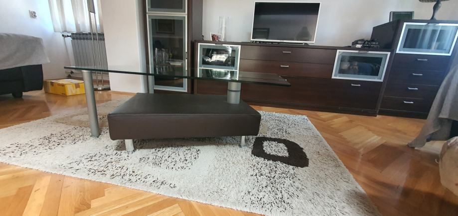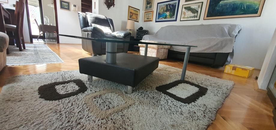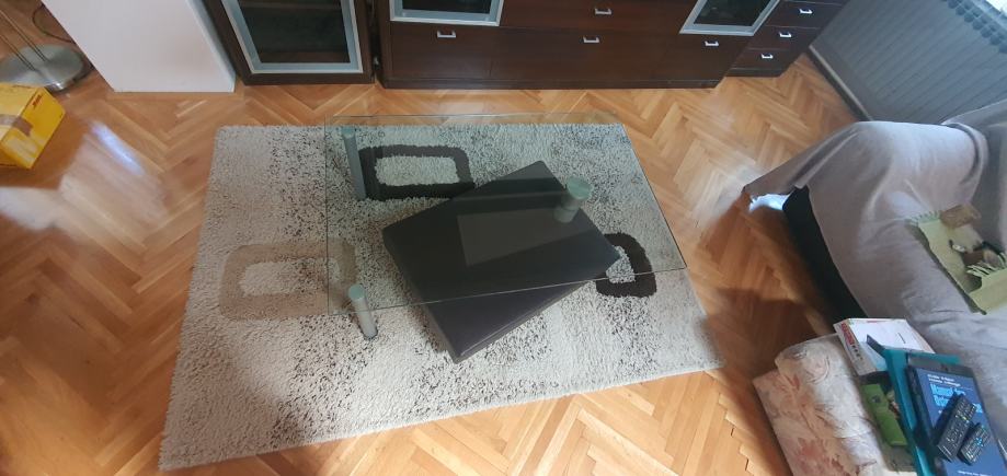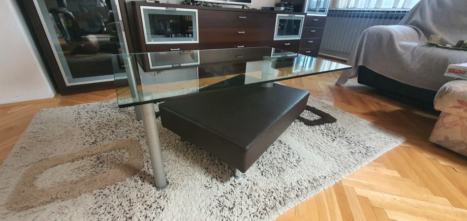 Prodaje se stolić za dnevni boravak sa staklenom pločom i pomičnim donjim ležištem od umjetne kože.