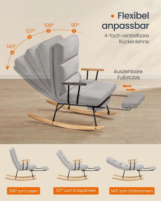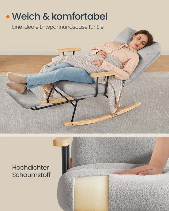 Naslon naslonjača je podesiv na 4 načina. Bilo da želite odrijemati nakon večere ili čitati knjigu, pronaći ćete idealan položaj. Zahvaljujući jednostavnom dizajnu i bijeloj boji, ova velika stolica za ljuljanje može se lako integrirati u vaš dom i savršeno pristaje u spavaćoj sobi, dnevnoj sobi ili radnoj sobi. Robusni čelični okvir i prvoklasne noge od punog drva daju ovoj stolici dobru nosivost do 160 kg i visoku stabilnost. Nježno zakrivljene nožice sprječavaju prevrtanje, a protuklizni filc pruža veću sigurnost. Proširite oslonac za noge stolice za ljuljanje, podignite noge - možete udobno odspavati na ovoj fotelji. Mekani flis, jastuk za sjedenje podstavljen pjenom visoke gustoće, naslon za leđa ispunjen poliesterskim vlaknima i dubina sjedala od 50 cm - sve to osigurava udobno iskustvo sjedenja. Za sve informacije nazovite na broj telefona 092/399-75-19
