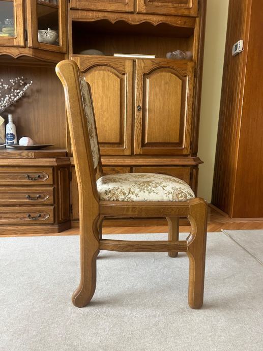 Prodajem drvene stolice s tapeciranim sjedalom i naslonom. Izrađena je od masivnog drva u toploj smeđoj boji, a presvlaka je u krem tonu s cvjetnim uzorkom u smeđim nijansama. Stolica je odlične konstrukcije, klasičnog dizajna.