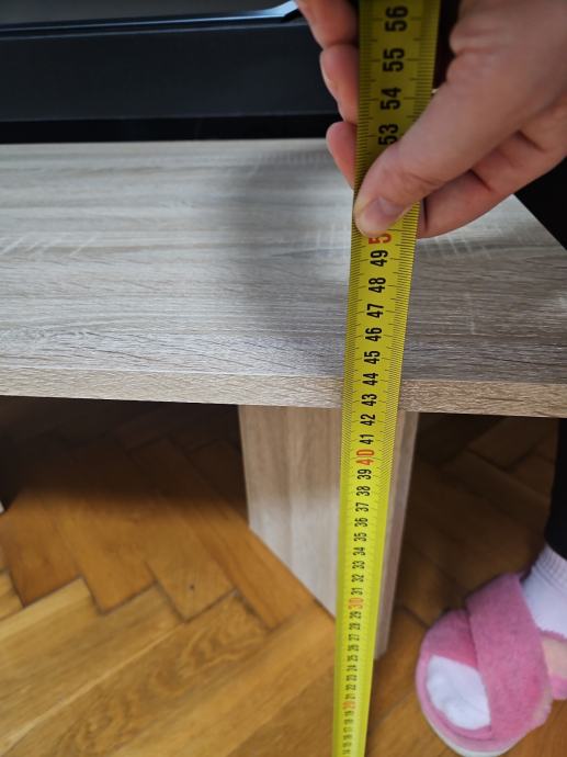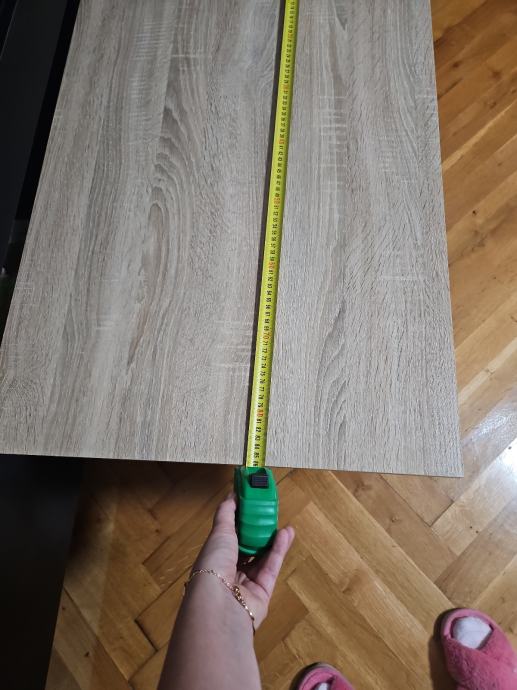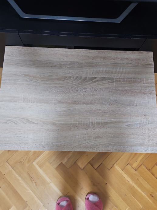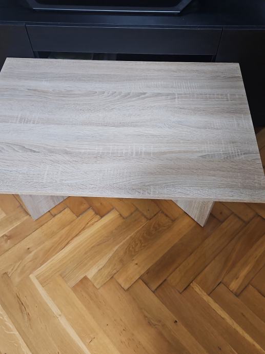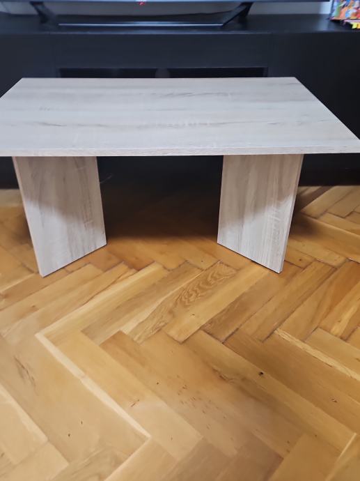 Prodajem stolić za dnevni boravak u dekoru svijetlog hrasta. Jednostavnog i čistog dizajna, s ravnom pločom i dvije bočne noge. Izrađen od ploče iverice s drvenim uzorkom koji se lijepo uklapa u različite interijere.