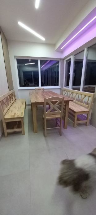 Stolovi se rade po meri table si izradjene od sitnih komada drveta ili cink ploca.