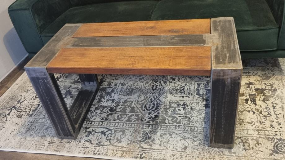 Prodajem unukatni ručno rađeni stolić kombinacije metala i punog drveta hrasta. Dimenzije stola su 100/50/50 cm.