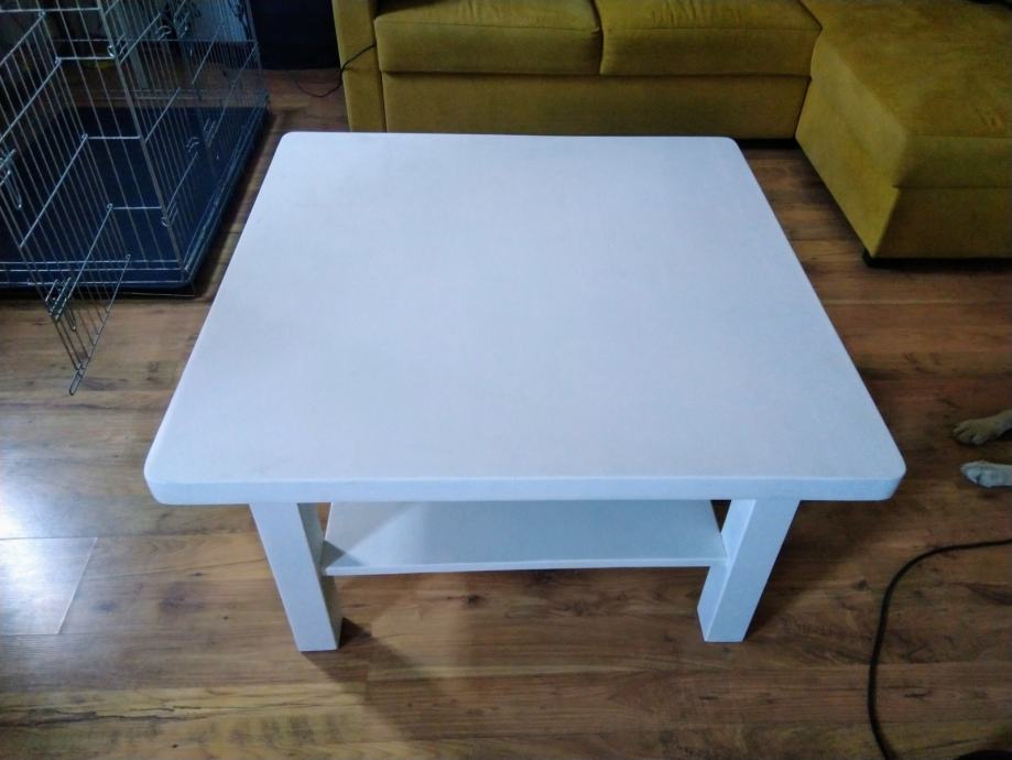 ''Malo veći'' stolić za dnevni boravak, za nekog tko želi prostran i kvalitetan stol; stol je od hrastovine, ništa iverica, sve puno drvo i izuzetno je težak (jedva ga nosi 1 muška osoba); premazan je temeljnim bijelim lakom za drvo, dimenzije su 90x90 širina duljina, a visina je 50 cm; paše u prostraniji prostor...