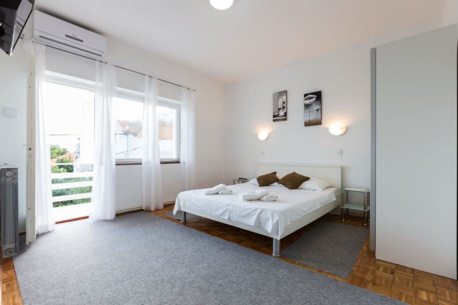 Apartman 2+1 sa pogledom na more sastoji se od spavaće sobe sa bračnim krevetom i po potrebi pomoćnim rasklopivim turističkim ležajem,potpuno opremljene kuhinje, blagavaone i kupatila sa tušem na prvom katu kuće sa balkonom na kojem su gosti sami.U apartmanu je na raspolaganju free Wi Fi,tv i klima uređaj.