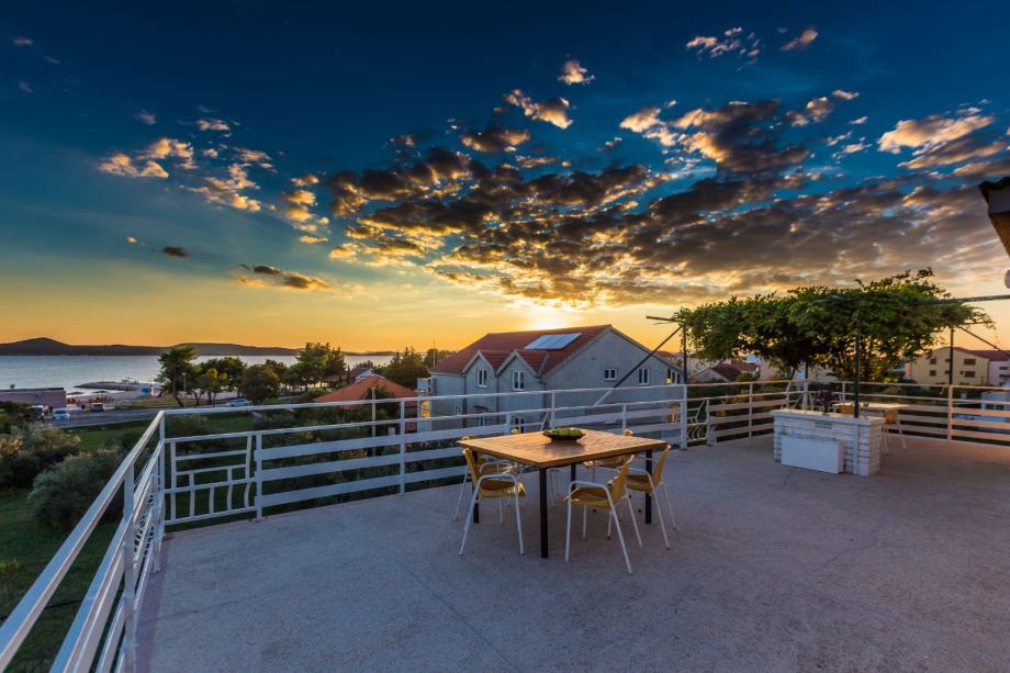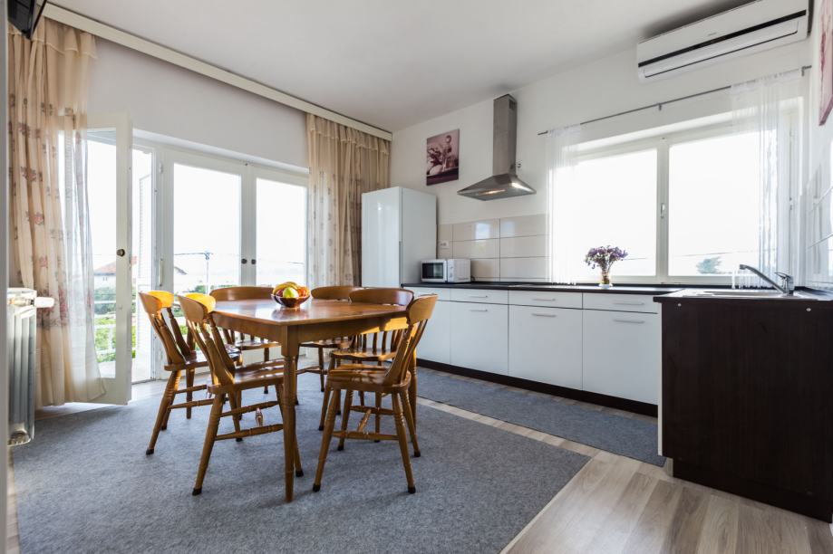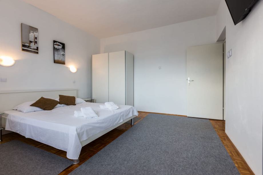 Apartman za 7+2 osobe proteže se preko cijelog drugog kata kuće , 114 m² , Apartman ima 3 spavaće sobe ,potpuno opremljena kuhinja , blagovaonica , tuš , dva WC - a , TV , klimu ,free Wi-Fi, veliku terasu od 70 m2 na kojoj su gosti sami ( kombinacija , dio u hladu ,a dio na suncu ) .Cijena za 7 osoba od 90 eura do 150 eura po noći.U cijenu uključena boravišna taksa