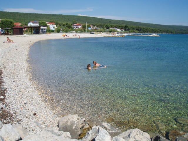 Plaža je kombinirano betonska i šljunčana cca 100 m udaljena od apartmana ,a 150 m od apartmana se nalazi mala pjeskovita plaža .Kamenita plaža udaljena je od apartmana 500 m u borovoj šumi duga 4 km.
