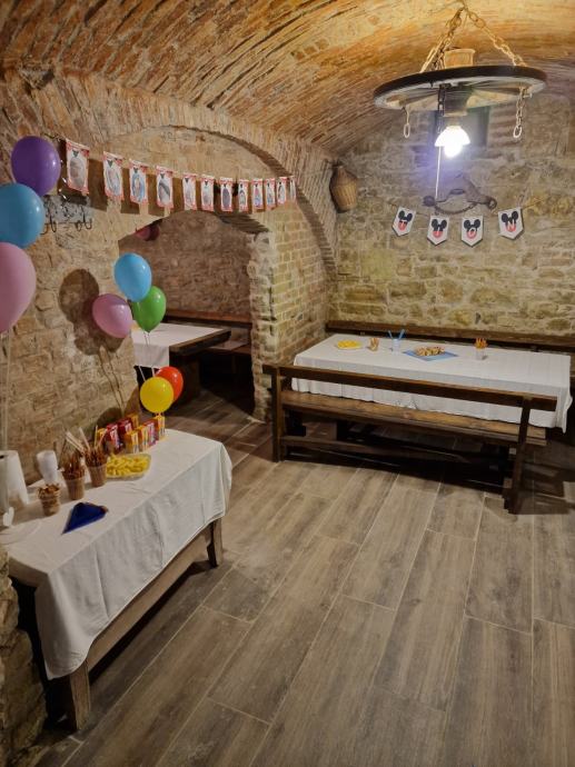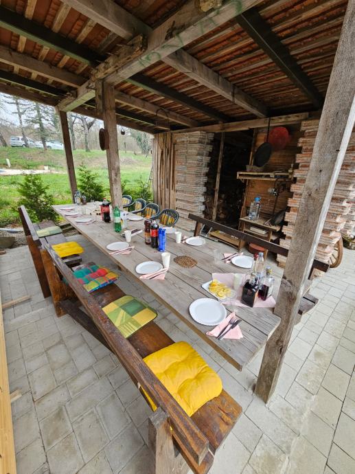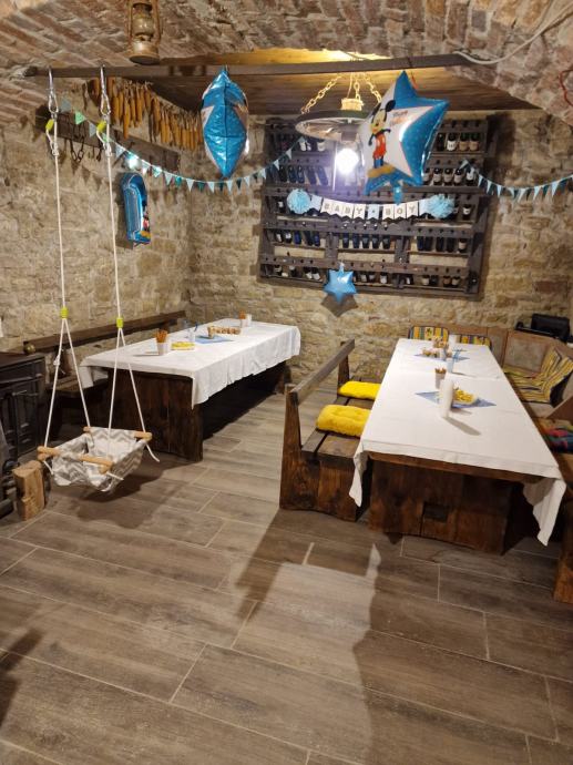 Na vanjskoj terasi pored roštilja ima stol i klupa za 15tak ljudi, također na raspolaganju imate uređen podrum koji ima 30 sjedećih mjesta za objed i druženje te se u sklopu podruma nalaze 2 wc-a.