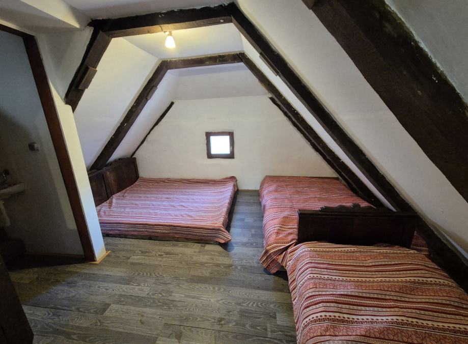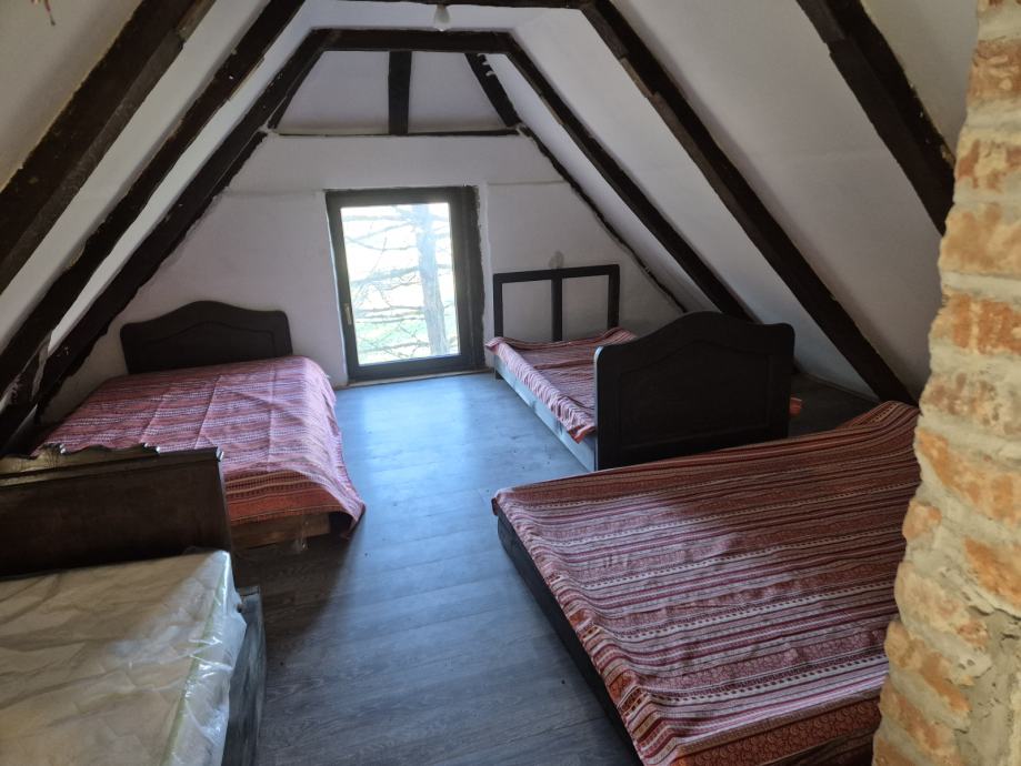 Kuća ima tavan na kojem se nalazi jos 9 kreveta (2 bracna kreveta i 5 manjih) te se na tavanu nalazi wc i umivaonik.