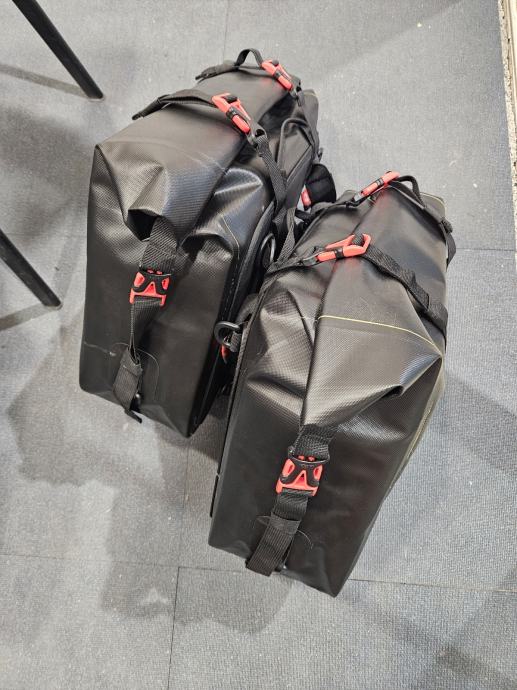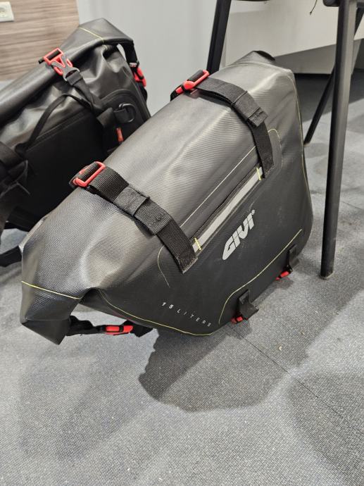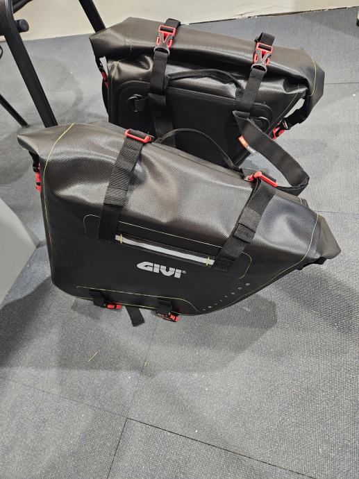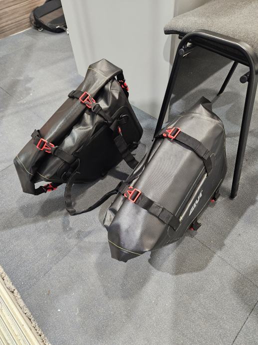 Na prodaju jedan par GIVI bočnih torba (lijeva+desna). Naručene, stavljene na motocikl i skinute, novo. Ne zahtjevaju nikakve dodatne nosače ili držače, samo se stavi remen ispod sjedala, zategne i vozi.