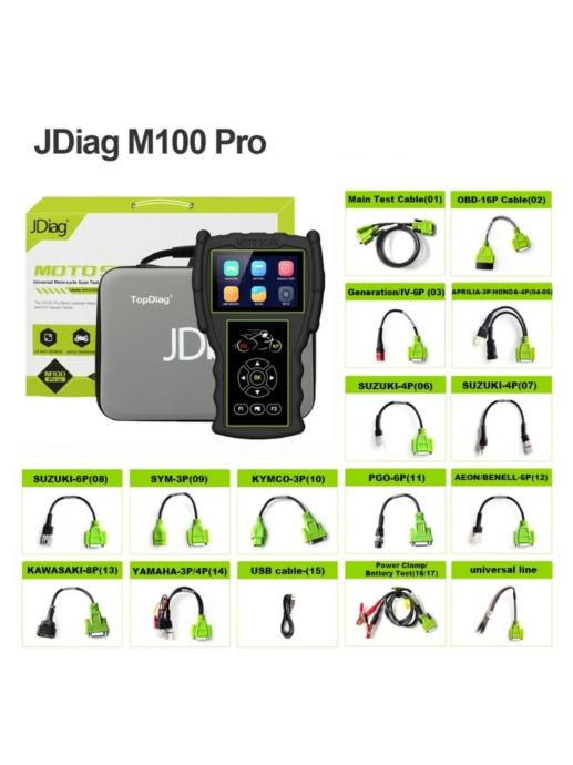 JDiag M100 Pro Moto Skener nova je generacija ručnog dijagnostičkog alata za motocikle, koji pokriva dijagnostičke funkcije gotovo svih poznatih proizvođača. Pomaže tehničarima da brže dijagnosticiraju probleme i izvrše popravke, s obzirom na to da mnogi uobičajeni postupci (ubrizgavanje goriva, paljenje, zavojnice, pumpa za gorivo itd.) već postoje unutar uređaja.