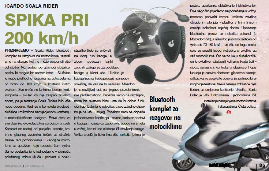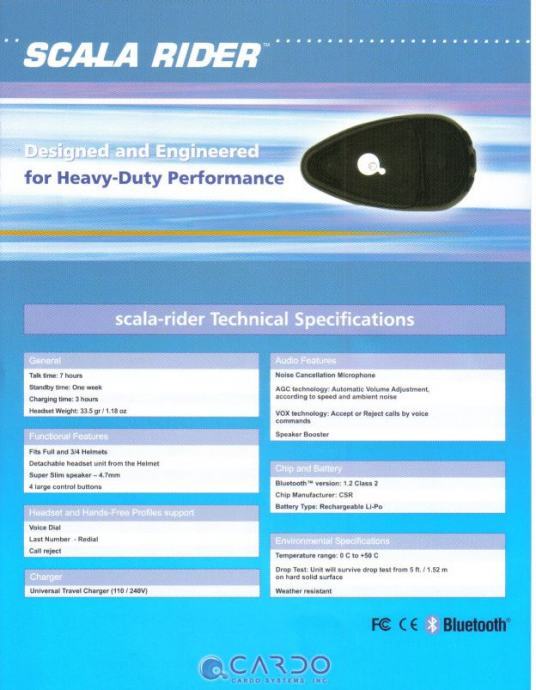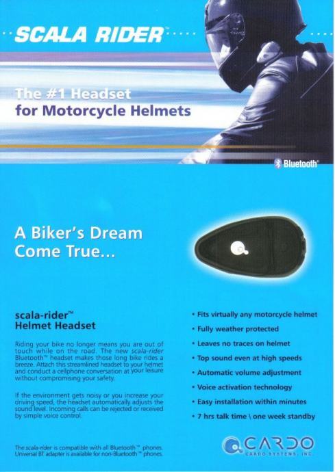 Handsfree and safe cellphone communication for motorcycle riders. The SCALA RIDER Bluetooth headset is a great solution to a real need: Now bikers too can benefit from wireless cellular communication and even receive GPS voice instructions from a Bluetooth equipped GPS without compromising security or comfort. The SCALA RIDER is a truly innovative and easy-to-use communication device, providing safe and convenient cellular connectivity for motorcycle riders. Along with the comfort, the SCALA RIDER is strong on safety: If the environment gets noisy or you increase your driving speed, the headset automatically adjusts the sound level. Incoming calls may be rejected or accepted by voice-control. No need to take your hands off the handle bar.