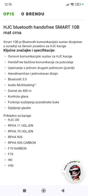 Vrhunska komunikacija Sena 10b isključivo za hjc kacige ,kratko korištena niti 5 puta , prodajem jer sam prodao kacigu ,stanje 10/10 sa rezervnom baterijom(20 eura) ,odgovara samo za ove tipove kaciga :
