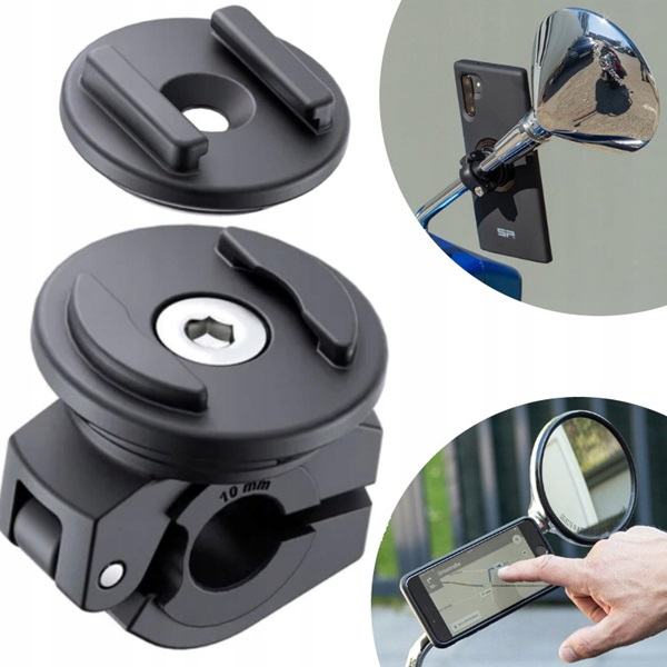 360° podesiv nosač niskog profila koji vam daje mogućnost montiranja kućišta pametnog telefona na ogledalo ili prečku. Uključuje adaptere za kompatibilnost s promjerima od 10 mm, 12 mm, 14 mm i 16 mm (5/8"). Drži uređaj na sigurnom mjestu u vašem vidnom polju.
