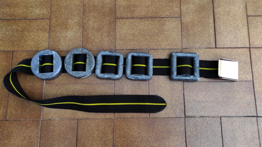 Ronilački remen Omersub i 5 komada utega od 1 kg + još jedan uteg od 1 kg.
