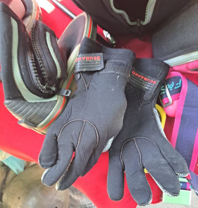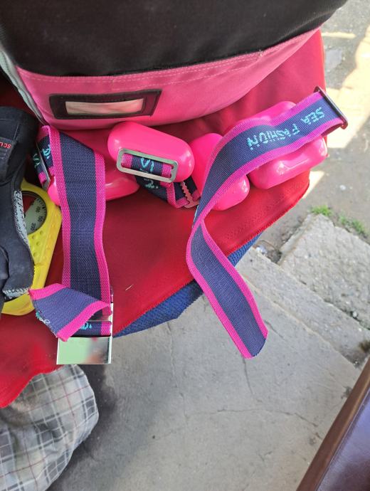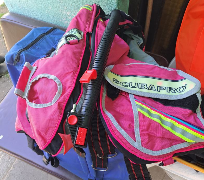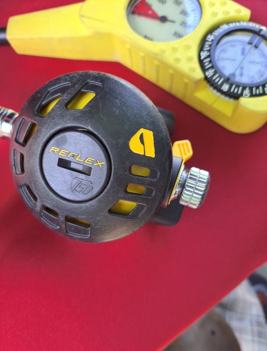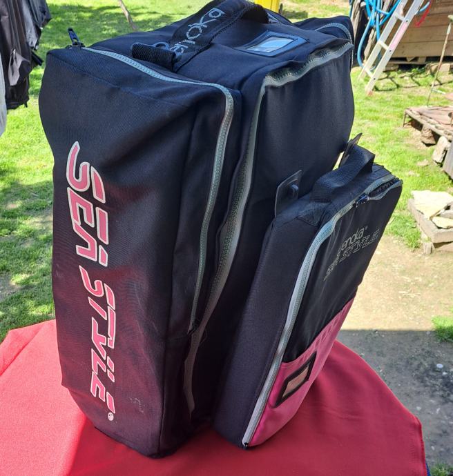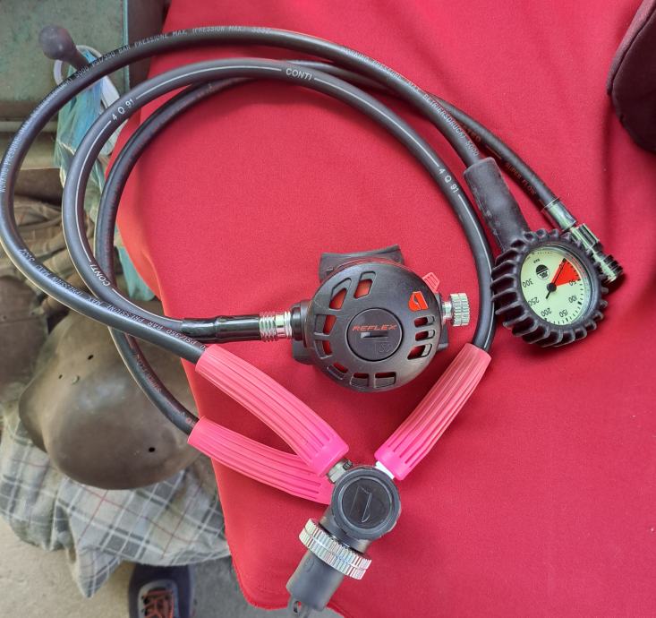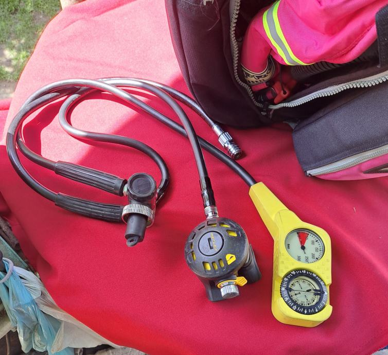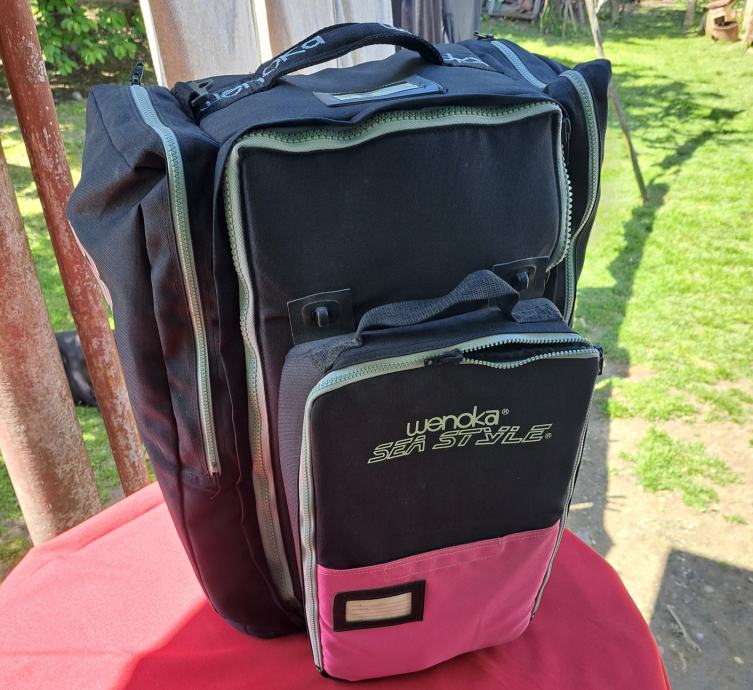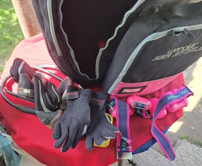 Velika torba Wenoka Sea Stayle sa ženskom ronilačkom opremom u kojoj se nalaze dva kompenzatora plovnosti i regulatora Reflex 150 i kompas, remen sa utezima, rukavice, cipele broj 39, prsluk Scubapro i peraje Mares. Sve je korišteno, ali u vrlo dobrom stanju. Regulatori i kompenzatori provjereni. Cijena je za cijeli komplet.