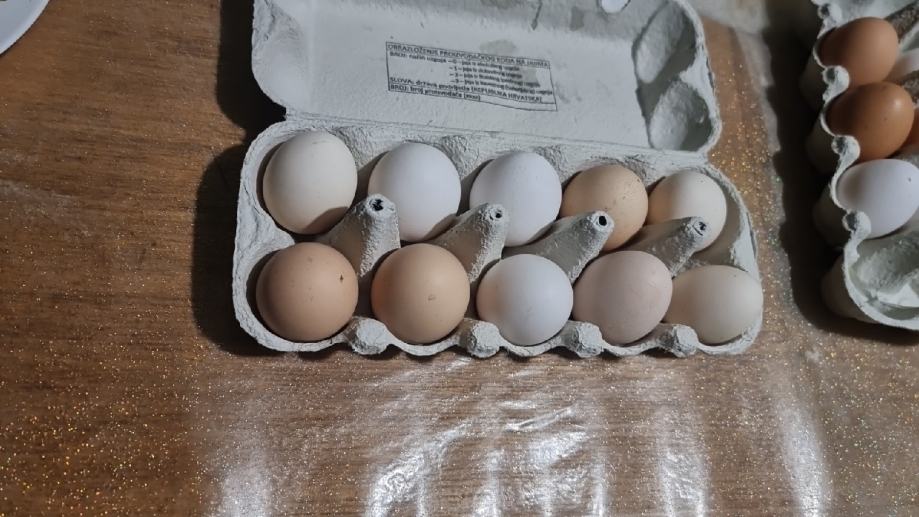 Prodajem domaća jaja bijela s manje kolesterola i smeđa. Cijena kutije od 10 kom 3 eura.