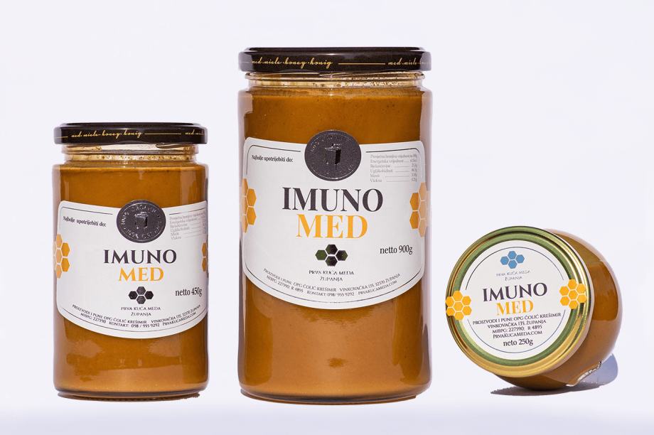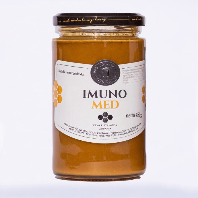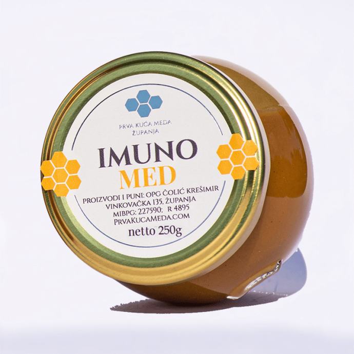 Imuno med je cijenjena mješavina 4 vrste meda, cvjetnog praha i propolisa, koja podiže imunitet organizma na prirodan način. Osigurava sve bitne vitamine i minerale iz meda te vrijedne proteine i kiseline iz peludi i propolisa. Pogodan je za preventivno korištenje prije sezone prehlade i gripe, kao i za vraćanje snage organizma nakon bolesti.