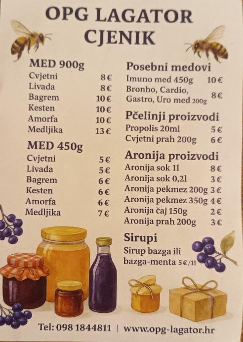 BRONHO MED: mješavina meda, propolisa te mljeveni: ansi, hren, crni kim, kadulja, ružmarin i kopriva. Te tinkture: islandski lišaj, lavanda, bršljan bijeli sljez , trputac, divizma, majčina dušica, borove iglice. 200g