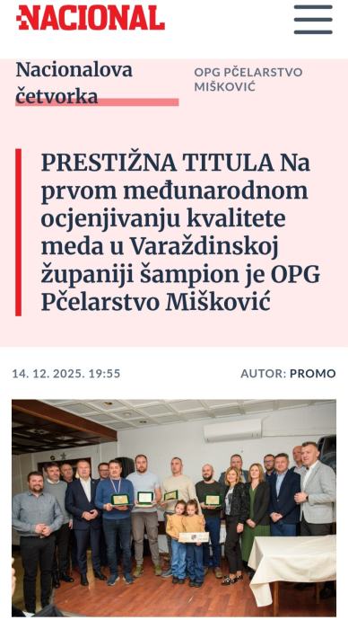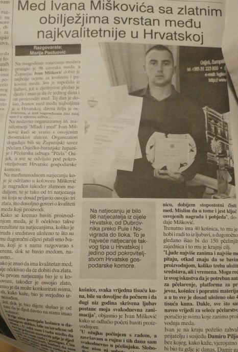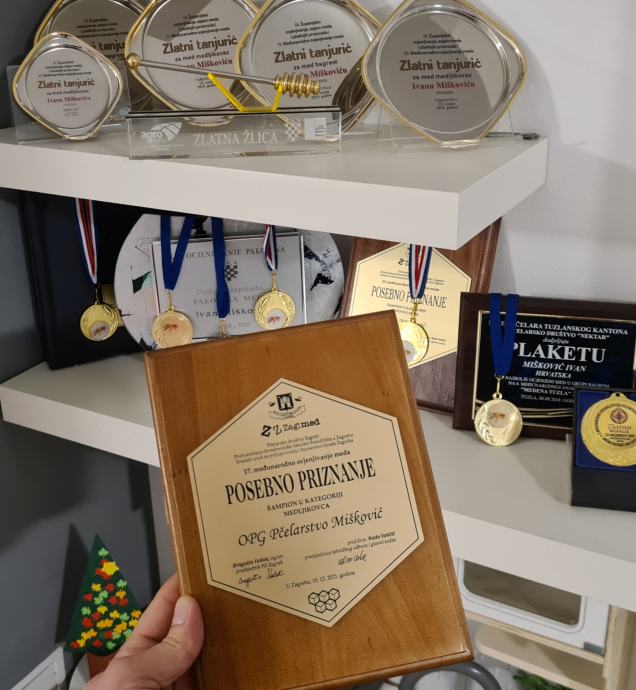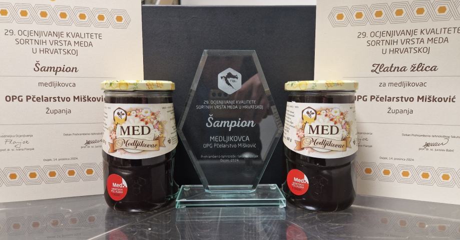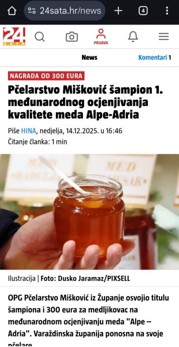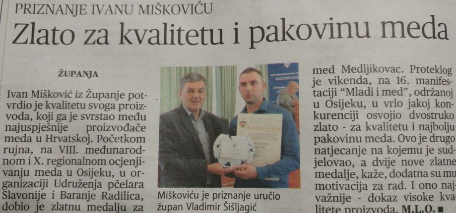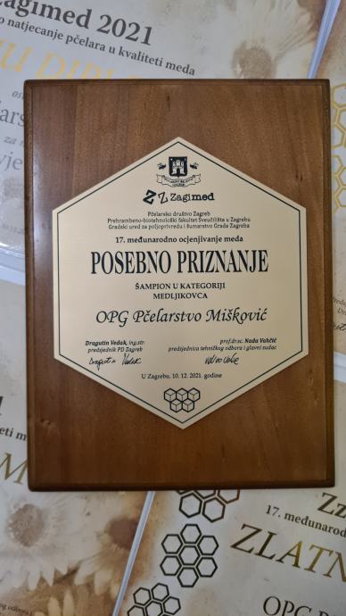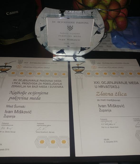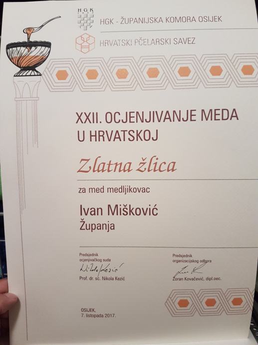 ŠUMSKI MED(MEDLJIKOVAC) IZUZETNE KVALITETE. ZLATNA ŽLICA VIŠEGODIŠNJA I ŠAMPIONI GRUPA. UZ MED MOGU POSLATI I KOPIJU ANALIZE MEDA. TAKOĐER MED JE PROGLAŠEN I NAJBOLJE OCJENJENIM MEDLJIKOVCEM,MEDUNOM IZ INOZEMSTVA U SLOVENIJI,GDJE JE BILO 252 UZORKA MEDA.SLIKA PRIZNANJA JE VIDLJIVA. U ZAGREBU I OSIJEKU 2 PUTA ŠAMPION GRUPE SA MEDLJIKOVCEM. MED JE BEZ KAPI ŠEĆERA I ŠEĆERNE PRIHRANE. TAKOĐER IMAM I KESTEN,BAGREM,CVIJETNI. SVI MEDOVI SA ZLATNIM PRIZNANJEM ZA KVALITETU I ČISTOĆU. MOŽETE I POGLEDATI NA FACEBOOKU "PČELARSTVO MIŠKOVIĆ" I DOBITI JOŠ VIŠE INFORMACIJA I SLIKA.