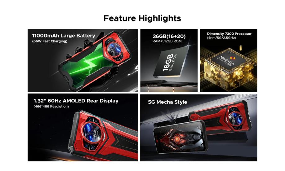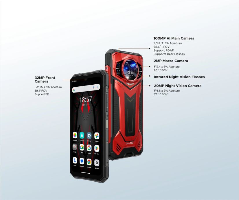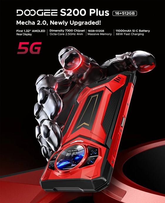 Prodaje sa DOOGEE S200 Plus 5G je izuzetno robustan pametni telefon dizajniran za najzahtjevnije uvjete, s certifikatima otpornosti. Pruža 6,72-inčni FHD+ zaslon s brzinom osvježavanja od 120 Hz za vrhunsko vizualno iskustvo, dok 1,32-inčni stražnji AMOLED zaslon sada nudi YouTube pregled, kompas, dinamične pozadine i prilagođeni potpis. Pokreće ga MediaTek Dimensity 7300 procesor s do 36GB RAM-a (16GB+20GB) i 512GB proširive memorije, savršeno za multitasking i igranje. Sa 100MP AI kamerom i ogromnom silicijsko-anodnom baterijom od 11,000 mAh s brzim punjenjem od 66W i obrnutim punjenjem od 10W, nudi dugotrajne performanse i vrhunske fotografije u svim uvjetima. I sve to s atraktivnim futurističkim i upečatljivim Mecha 2.0 dizajnom, sada istaknutim potpuno novom Volcanic Red bojom.