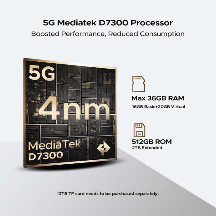 Opremljen MediaTek Dimensity 7300 procesorom i najnovijim Android 15 operativnim sustavom, V MAX LR isporučuje superiorne performanse i glatku odzivnost za sve vaše potrebe. Kombinacija 36GB RAM-a (16GB fizičke + 20GB proširenje) omogućuje besprijekoran multitasking – prelazite s navigacije na fotografiranje i komunikacijske aplikacije bez ikakvih usporavanja.