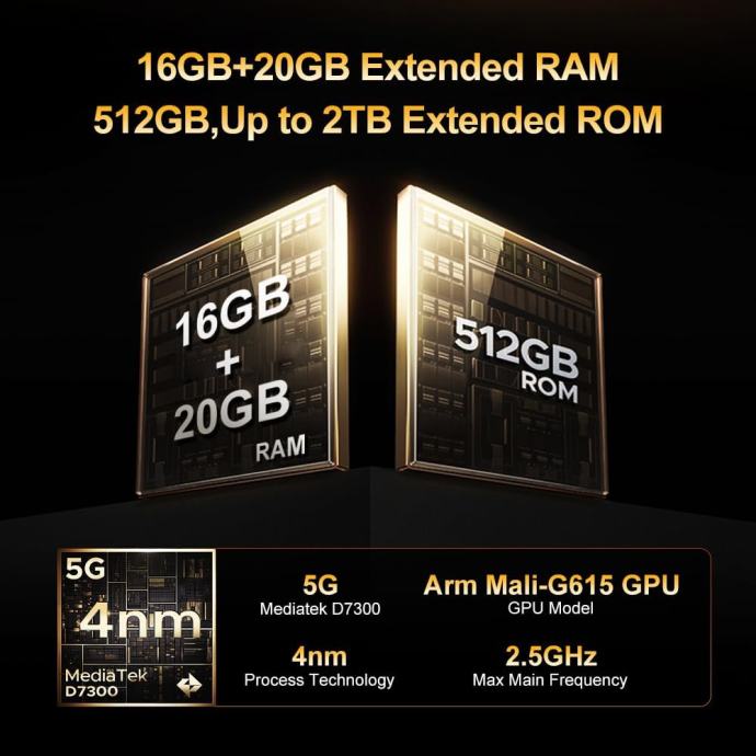 Pokretan MediaTek Dimensity 7300 5G čipsetom (4nm octa-core, 2.5GHz), V Max Play nudi besprijekorne performanse za najzahtjevnije zadatke. Kombinacija 16GB fizičke RAM memorije + 20GB virtualne RAM memorije (ukupno 36GB) osigurava glatko multitasking bez usporavanja, dok 512GB interne memorije (proširive do 2TB microSD karticom) pruža dovoljno prostora za sve vaše aplikacije, fotografije, videozapise i datoteke. Napredno hlađenje održava uređaj hladnim čak i tijekom intenzivnog korištenja.