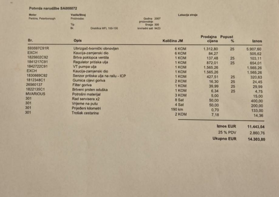 14.11.2024 godine na drobilici je rađen servis i svi Injektori u prilogu račun plaćeno sve 14.303 €