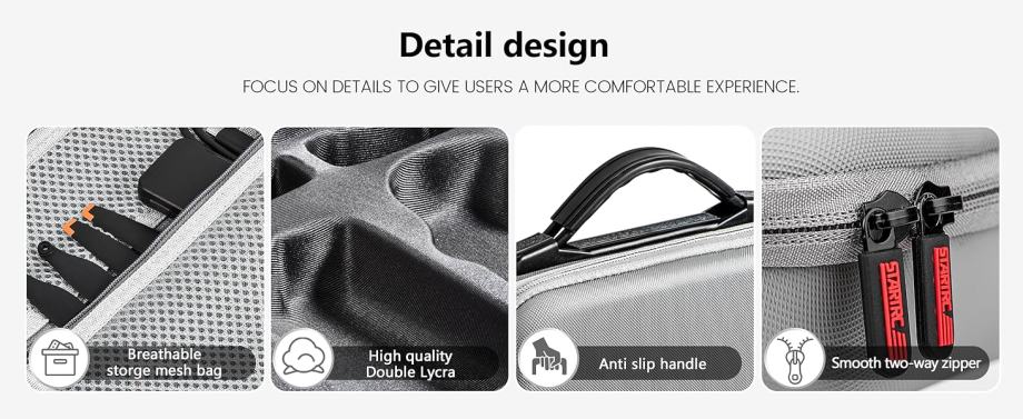 Large Capacity: It is capable of holding a drone, 1 remote controller, 3 batteries, 1 charger hub, cables, propellers, SD cards and many other drone accessories.