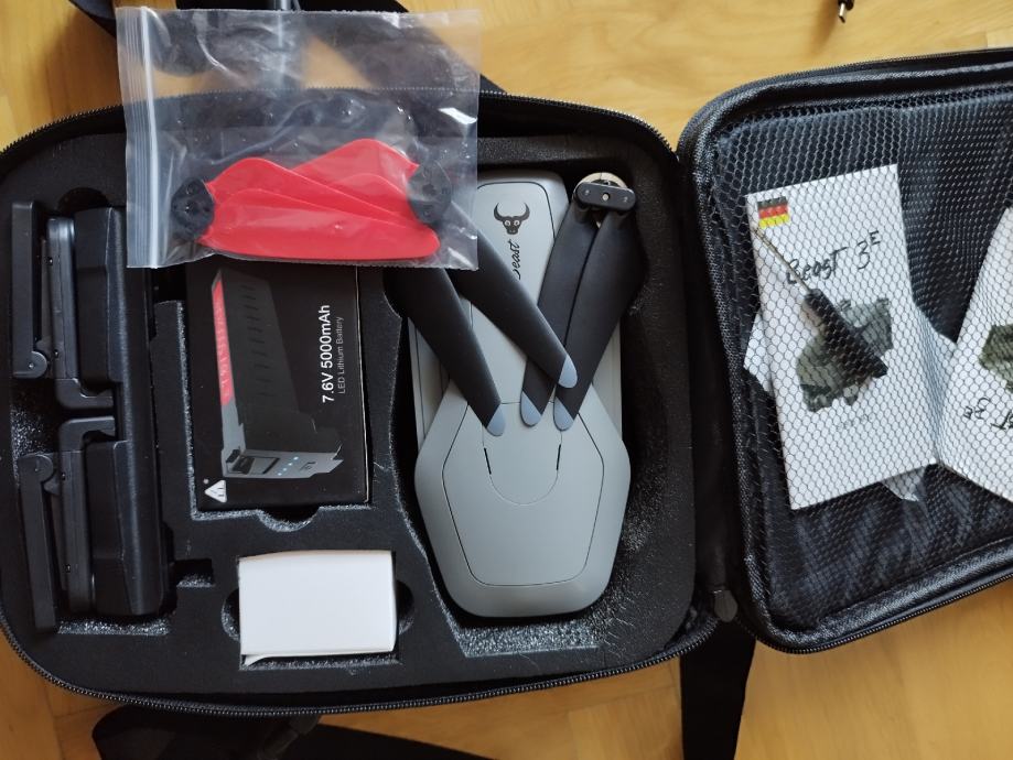 Uz dron ide 2 dodatna para propelera+ 1 par crvenih (poklon), 3 baterije, torba,kabel daljinski upravljač.