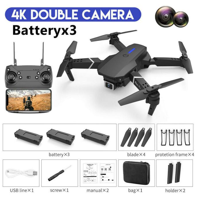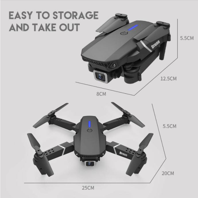 - Funkcije: gore / dolje, naprijed / nazad, lijevo / desno skretanje, bočni let, brzina leta u 3 koraka, LED svjetlo, način rada bez glave, automatski povratak jednom tipkom, način zadržavanja visine, WiFi FPV, putanja leta, kamera / video