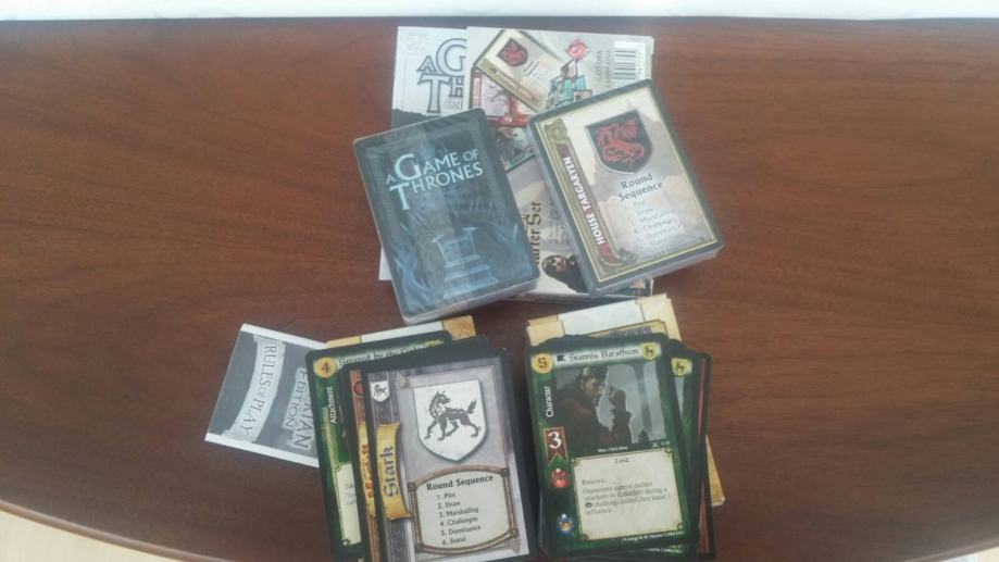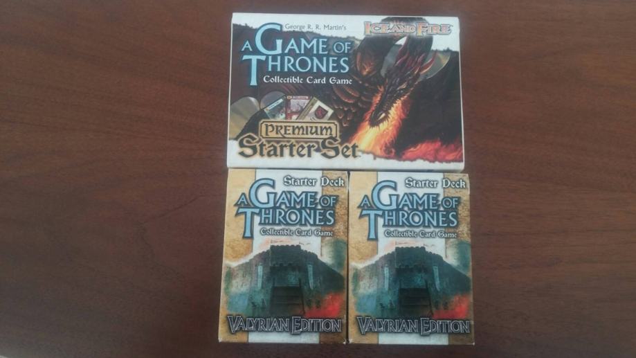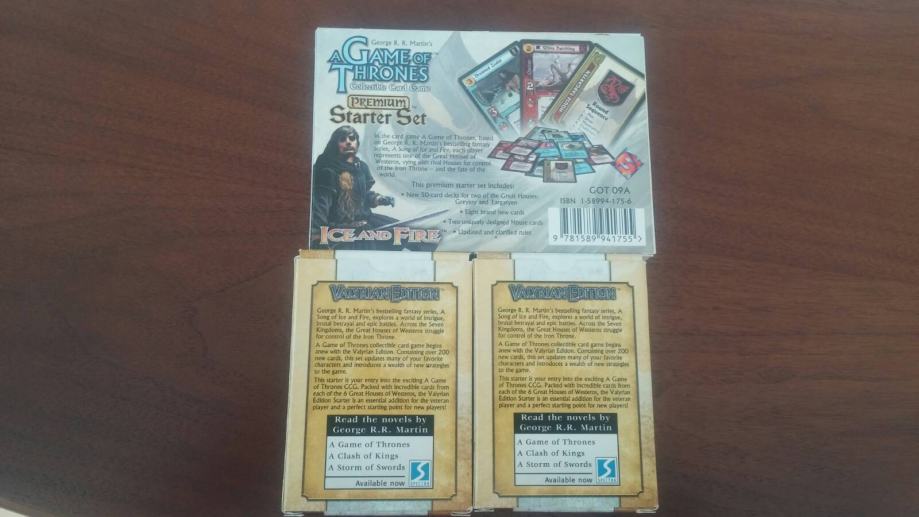 Igra prijestolja kartaska igra. U paketu se dobije veliki neotvoreni starter pocetni set za dva igraca (house Greyjoy i house Targaryen) i jos dva paketa s likovima iz svih kuca koji se mogu angazirati. Ukupno preko 220 karata s mnogim poznatim licima iz knjiga i serija (Tyrion i Jamie Lannister, Ned Stark...). Dovoljno za bezbroj kombinacija i dugorocno uzivanje u svijetu Westerosa.