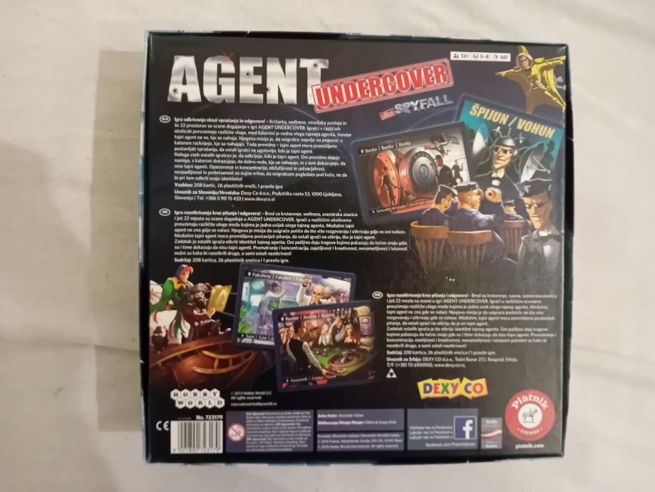 Društvena igra Agent spyfall sastoji se od špilova igraćih karata na hrvatskom i slovenskom jeziku i uputama za igru