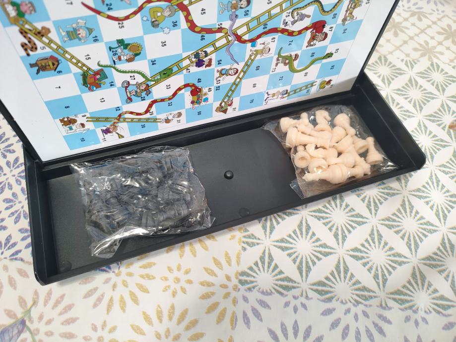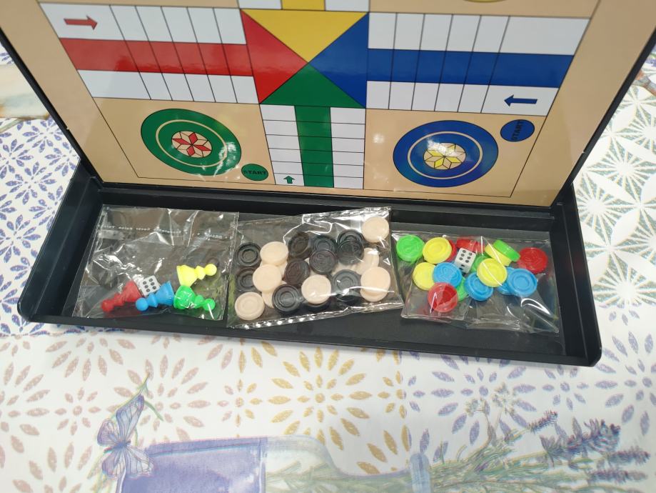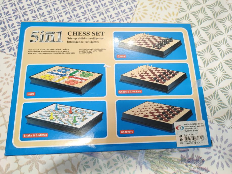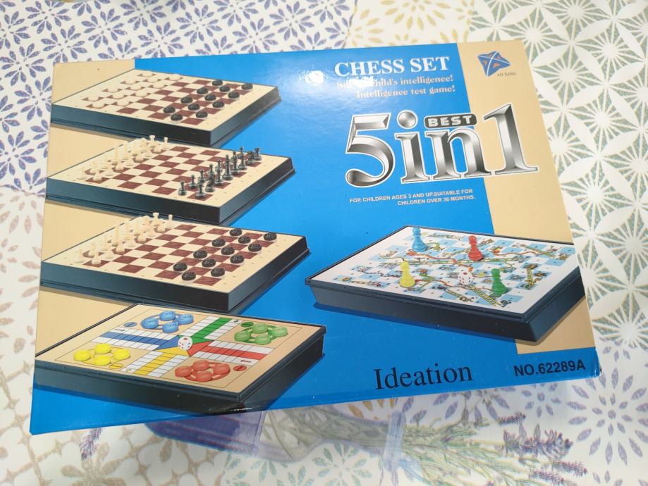 Drustvena igra Chess set 5in1 sadrzi 5 igara u sebi. Nijedan dio ne nedostaje. Prakticno za putovanja. Novo, koristeno 2x. Stanje vidljivo na slikama. Za ostala pitanja posaljite poruku.