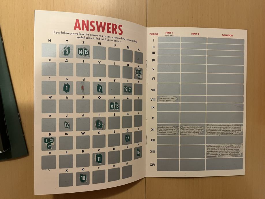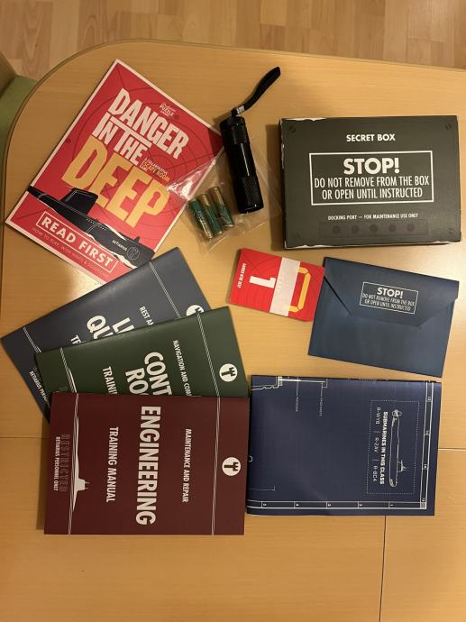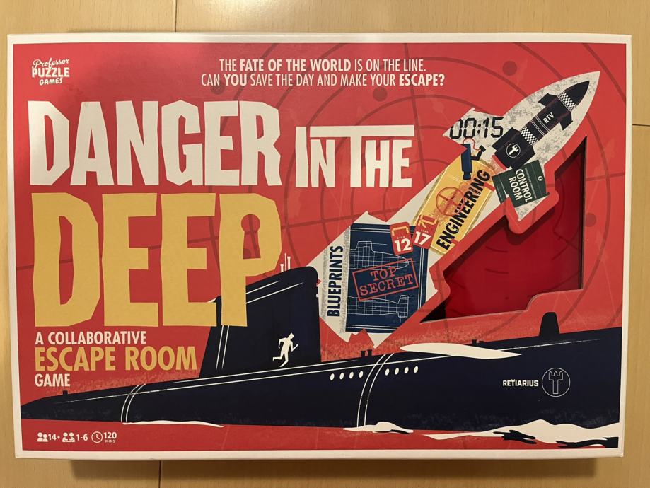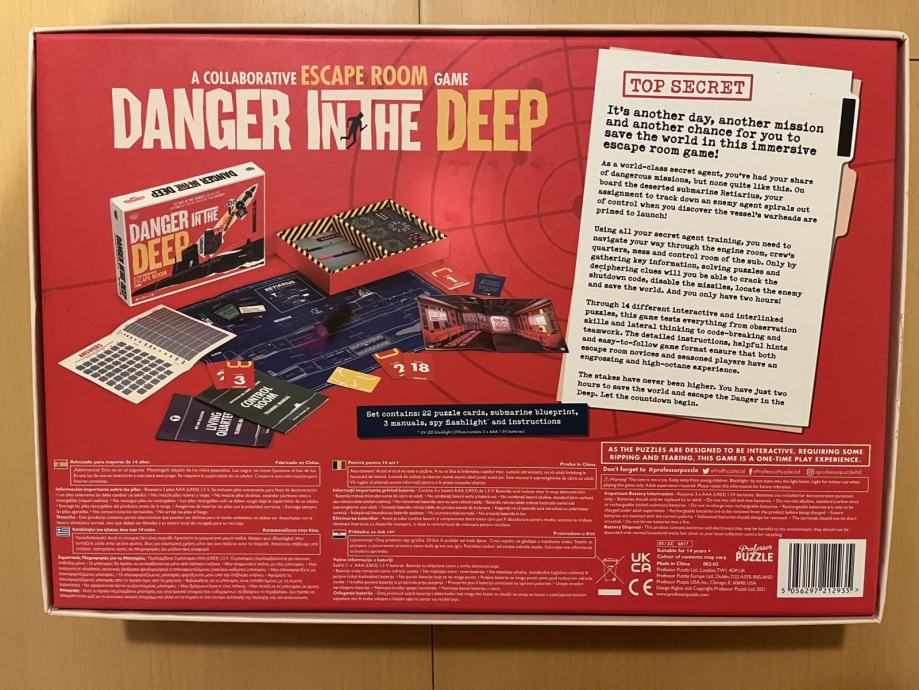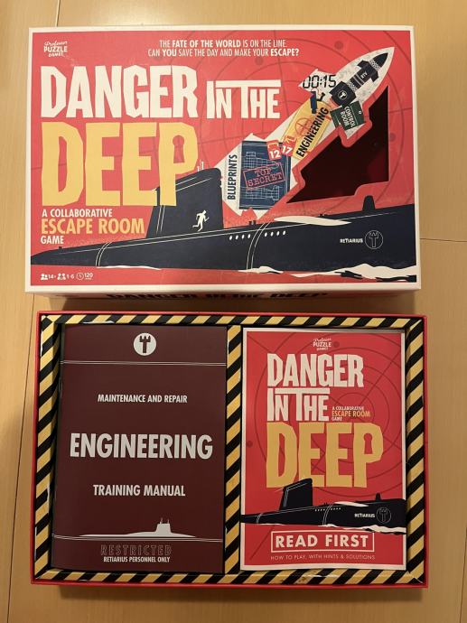 Kooperativna društvena igra Danger in the Deep (Professor Puzzle Games). Igra je u odličnom stanju - jednom odigrano, sve komponente su sačuvane i vraćene u početno stanje, uz iznimku stranice s odgovorima i hintovima u knjižici - na grebalici su pojedina polja otkrivena (vidi sliku).