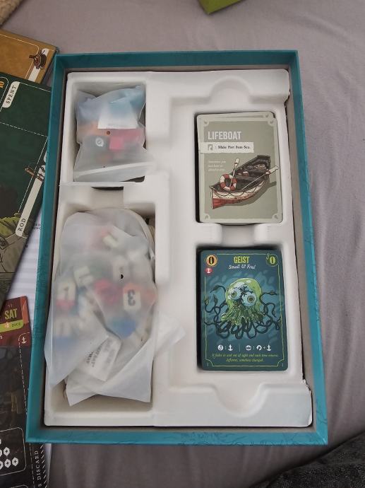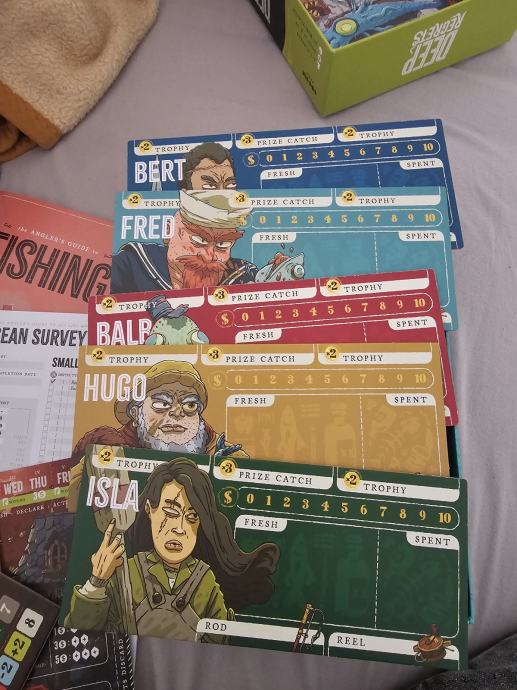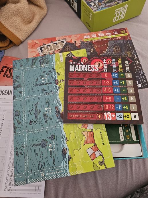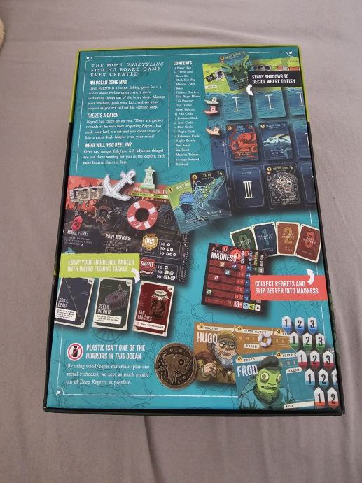 "Deep Regrets is a strategic horror fishing game for 1-5 players, aged 16 and up, running about 30 minutes per player. Decide what to eat, what to sell, what to mount, and how many regrets you're willing to carry, as you push yourself too far and spiral towards madness and a thrilling victory at sea… or an untimely end to your career"