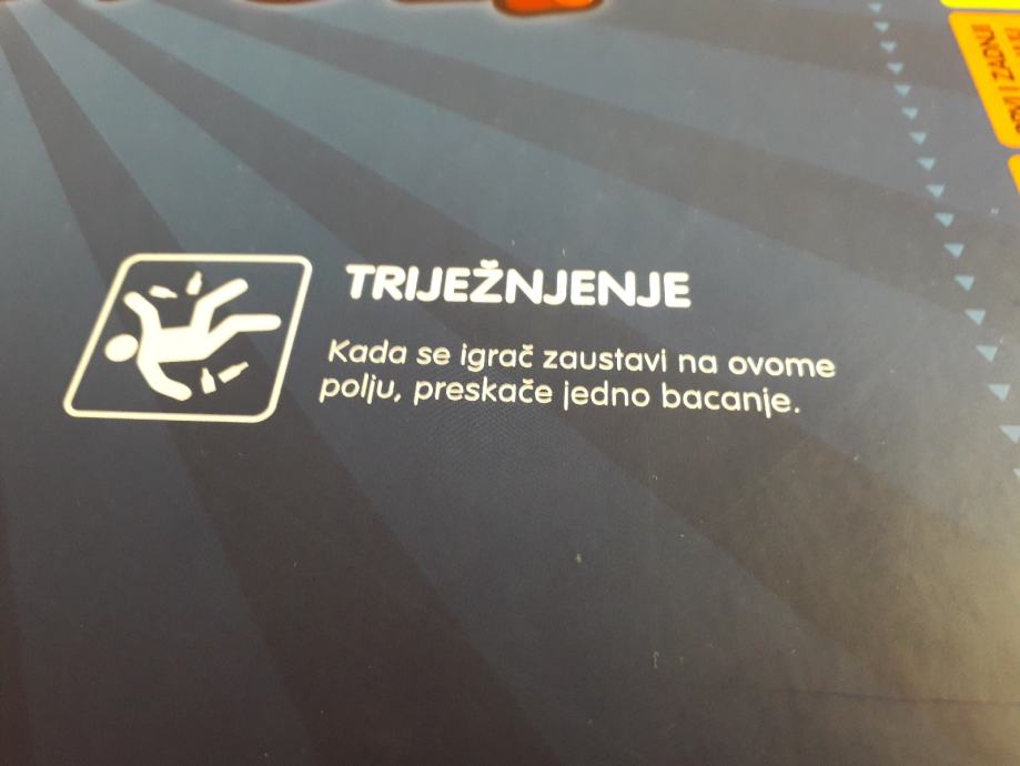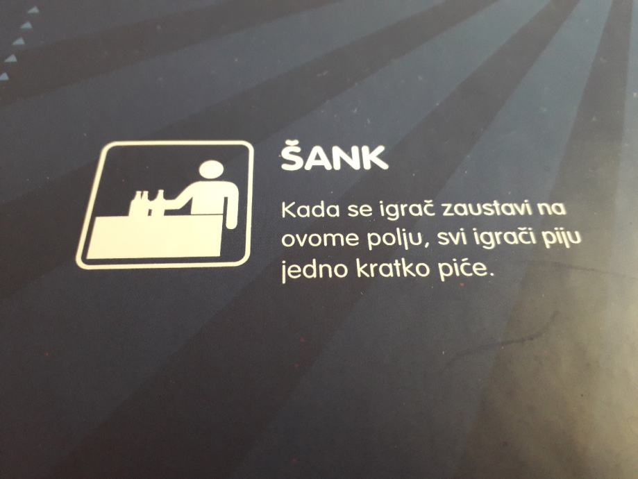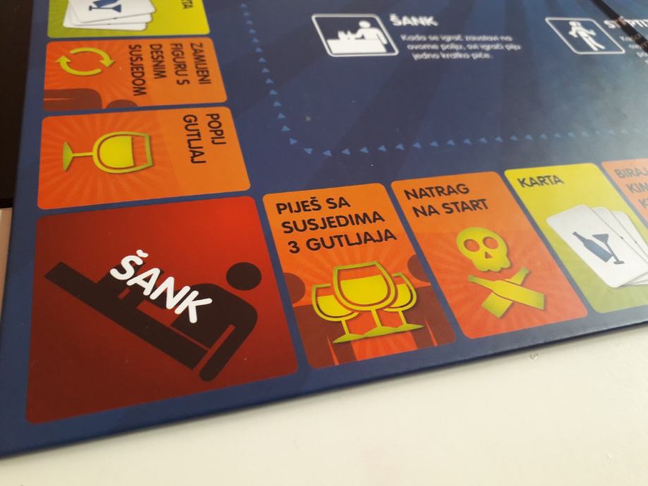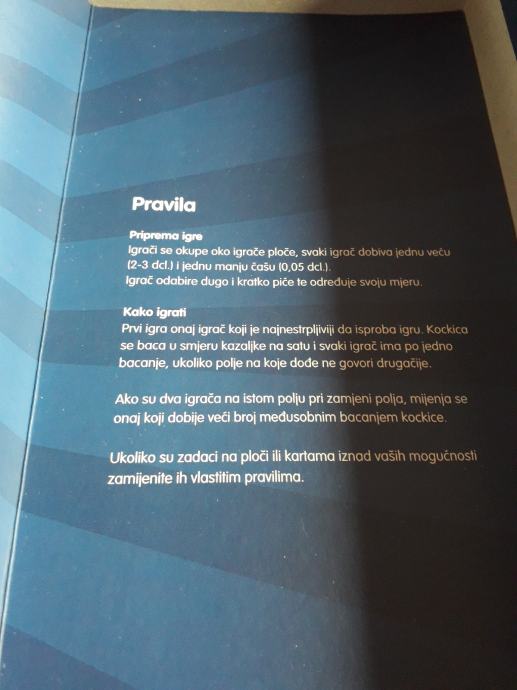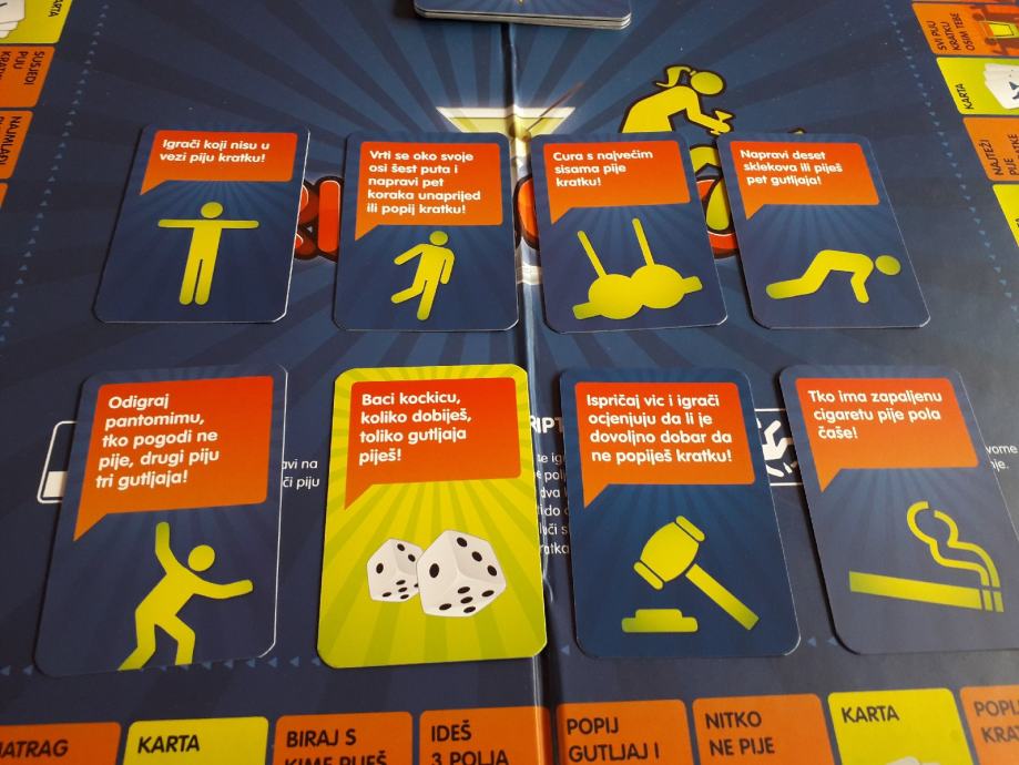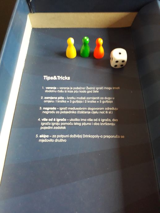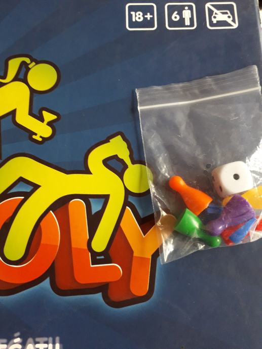 U kutiji se nalazi ploča za igranje s pripadajućim karticama, šesterostrana kocka i samo 3 figurice (3 su nestale...možete koristiti bilo kakve figurice iz bilo koje igrice, npr. Čovječe ne ljuti se), a umjesto njih dajem čepove od različitih piva.