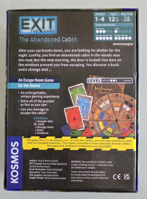 Exit: The Abandoned Cabin je puzzle igra napravljena po uzoru na Escape room, a uključuje komponente koje treba presavijati, pisati po njima ili trgati.