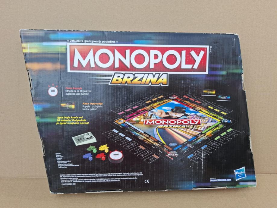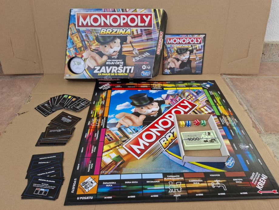 Monopoly Brzina je igra Monopoly koju ćete završiti u manje od 10 minuta! Igraju se četiri kruga. Svaki se krug sastoji od faze kupnje koju slijedi faza trgovanja.