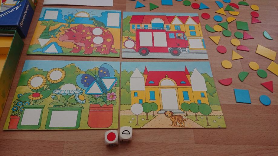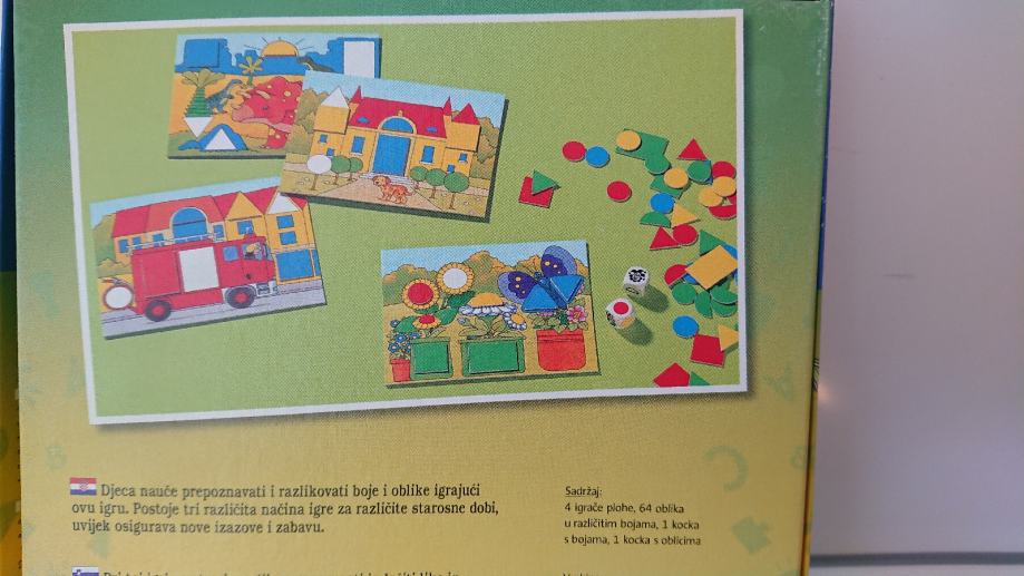 Igra sadrži: 4 igraće plohe, razne oblike u različitim bojama, 1 kocka s bojama, 1 kocka s oblicima.