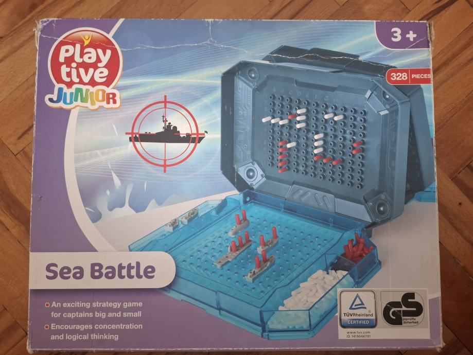 Strateška društvena igra Potapanje brodova, 328 dijelova (2 ploče za igru, 2 flote: jedna s pet jarbola, jedna s četiri jarbola, dvije s tri jarbola, jedna s dva jarbola) i skup klinova u dvije boje (bijela i crvena).