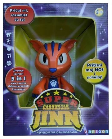 Društvena igra za djecu od 5 i više godina. Nevjerojatna igra pogađanja veznih uz čak 5 tema - sportovi, zanimanja, odjevni predmeti, voće i povrće i životinje! Odaberi temu i zamisli pojam... Pritisni mi nos. Slušaj pitanja i odgovaraj na njih a ja ću pogoditi što si zamislio! Igračka prepoznaje riječi: OK, Da, Ne, Ne znam, Ovisi, Ponovi i Nazad. Super Čarobnjak Jinn može pogoditi preko 750 pojmova! Baterije 3xAAA (uključene).