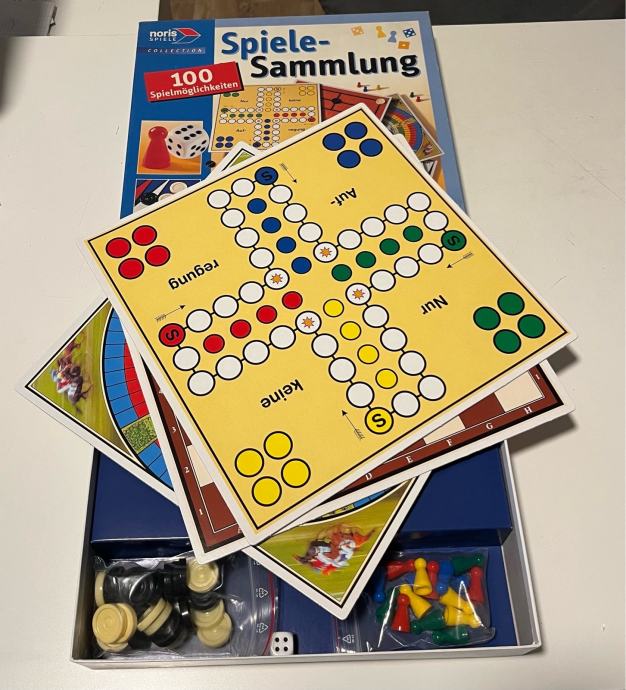 Prodajem kolekciju društvenih igara Noris Spiele Sammlung koja uključuje čak 100 različitih mogućnosti igranja. U kutiji se nalaze razne ploče za igranje, figure, kamenčići, kockice i ostali potrebni dijelovi za različite igre poput čovječe ne ljuti se, backgammona, dame i mnogih drugih klasičnih društvenih igara.