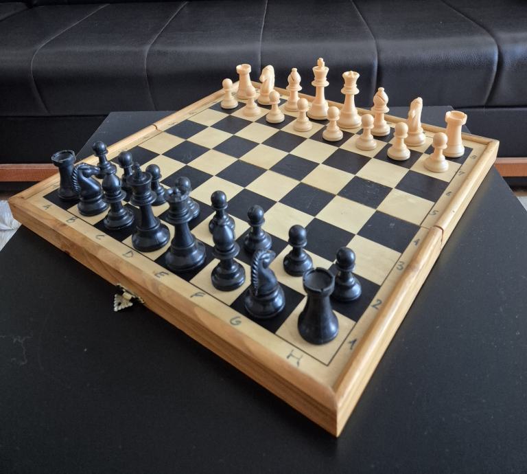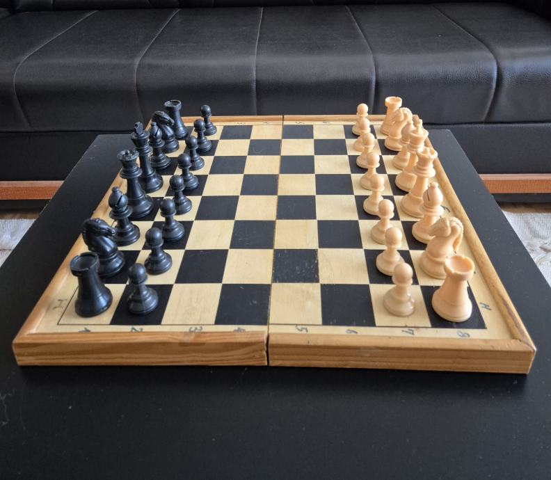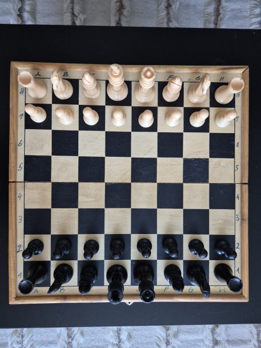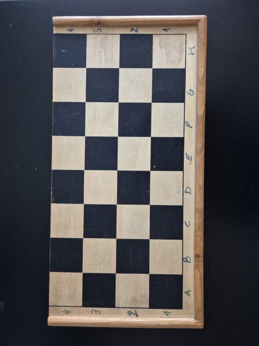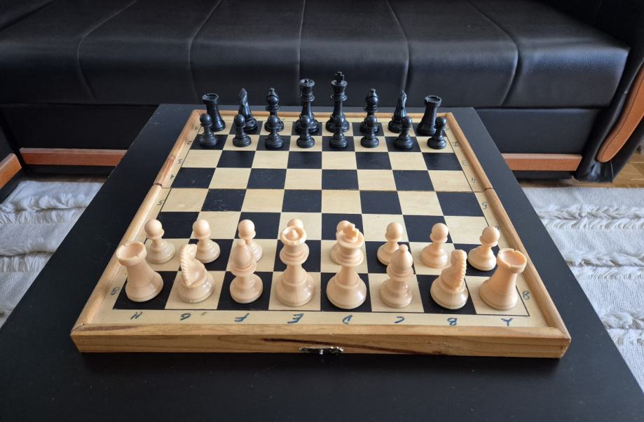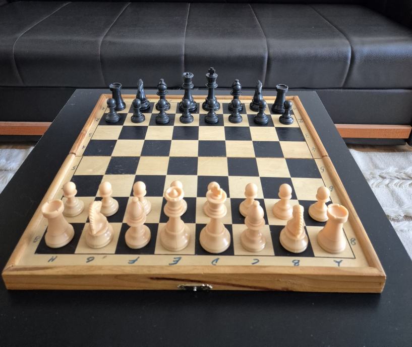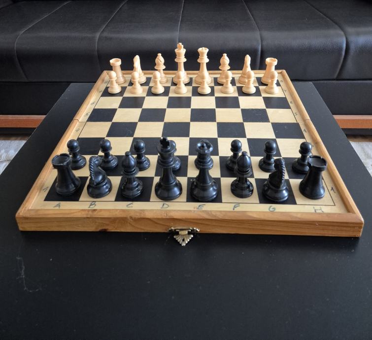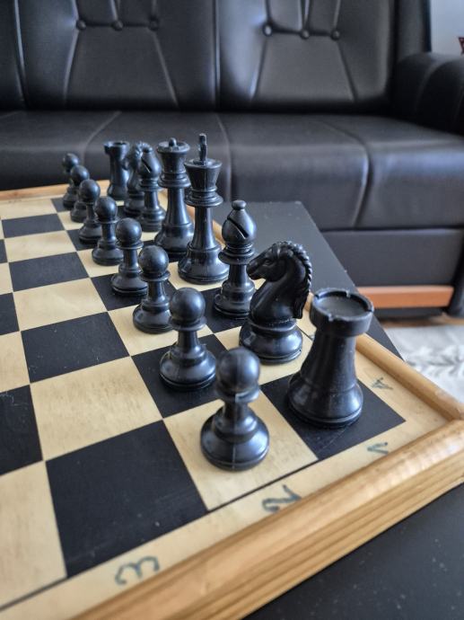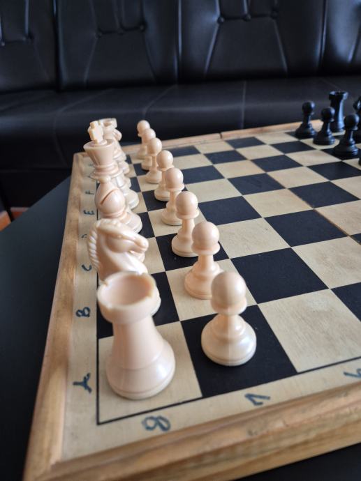 Prodajem drveni šah dimenzija 41x41 cm. Ploča je izrađena od drveta s klasičnim crno-bijelim poljima i oznakama slova i brojeva uz rubove. Kompletu su priložene sve figure u dvije boje, crnoj i bež/prirodnoj, u standardnom šahovskom rasporedu. Figure su plasticne, solidne izrade.