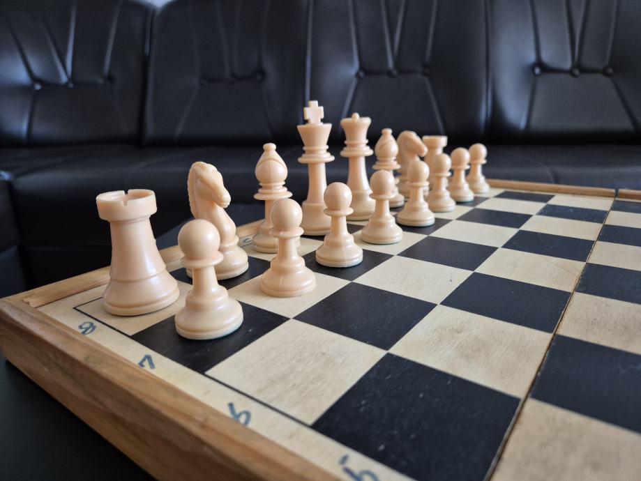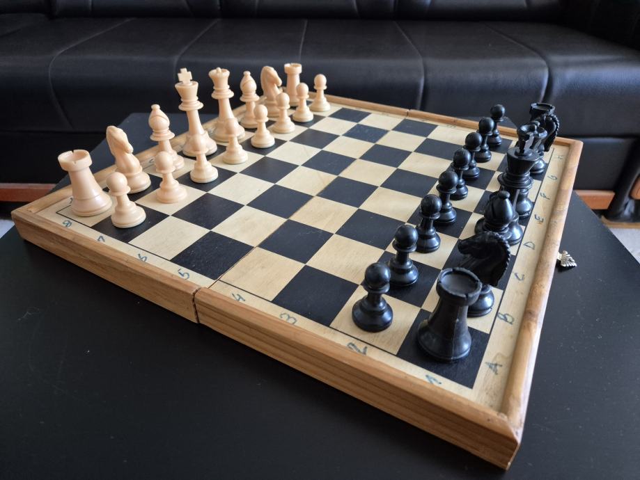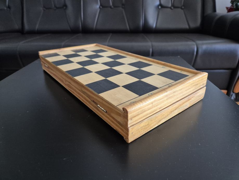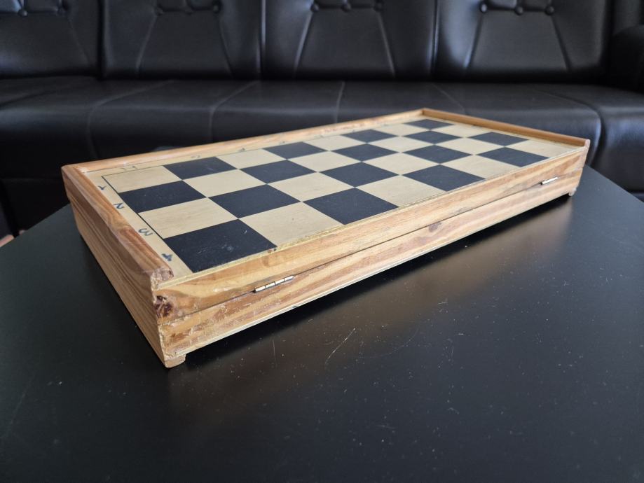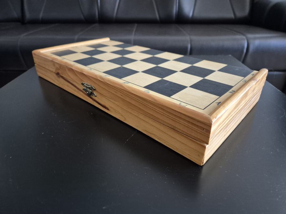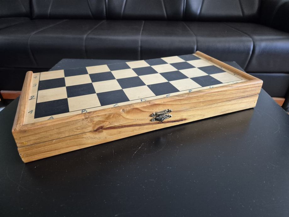 Prodajem drveni šah dimenzija 41x41 cm. Ploča je izrađena od drveta s klasičnim crno-bijelim poljima i oznakama slova i brojeva uz rubove. Kompletu su priložene sve figure u dvije boje, crnoj i bež/prirodnoj, u standardnom šahovskom rasporedu. Figure su plasticne, solidne izrade.
