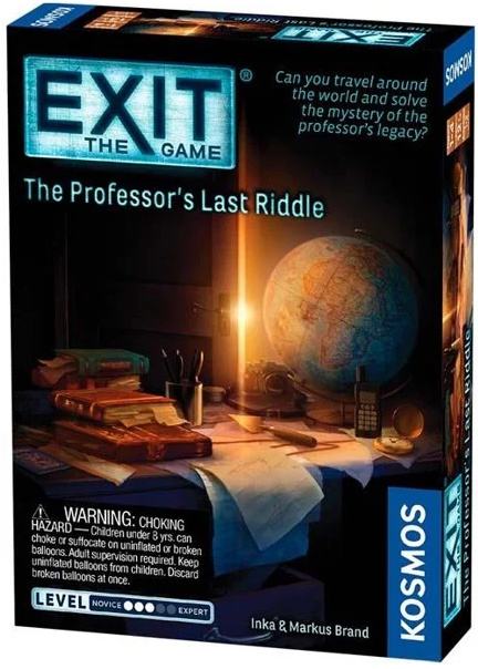 Around the world with EXIT! The world-famous professor Ian Jones recently passed away. The archaeologist loved puzzles! His travels took him to all parts of the world. He tirelessly searched for treasures believed to be lost, deciphered codes and translated secret writings.In this EXIT game, the 1-4 players can prove what they have learned from the professor while searching for his estate. Can you decipher the professor's legacy? Luckily, there are many tools at your disposal in this escape room game. Hurry, the time is ticking!Exit: The Game – The Professor's Last Riddle is a puzzle game modeled after escape rooms, and it includes components meant to be folded, written upon, or torn, so it's marketed as a single-use game.
