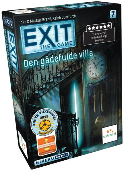 I er blevet inviteret til at gæste en stor, overdådig villa. Men det gode stopper der, for da I ankommer, tvinges I af ukendte individer til at deltage i et makabert spil. Uret tikker, og I skal være hurtige til at samarbejde og løse alle gåderne. Kan I mon undslippe villaen før det er for sent?EXIT-spillene er escape rooms i en æske. I står over for en række gåder og mysterier, som I skal løse på tid, så I kan 'undslippe' det sted, hvori I er fanget.Hvert EXIT spil udgør en større udfordring, som tager 1-2 timer at løse for en gruppe spillere - og spillet er beregnet til kun at blive spillet en gang. Hver æske har sit eget tema fra den forladte, arktiske forskningsstation til det hjemsøgte slot til den (måske) øde ø.EXIT 7: Den Gådefulde Villa har en sværhedsscore på 3/5.