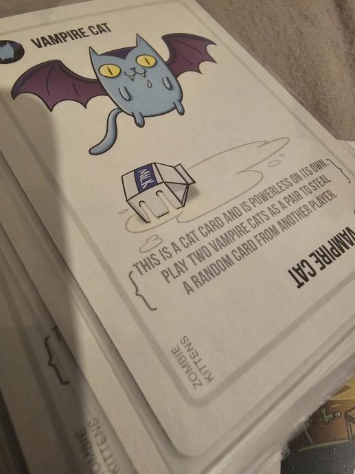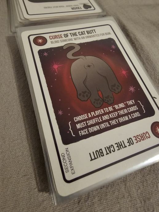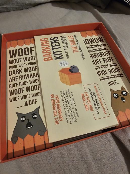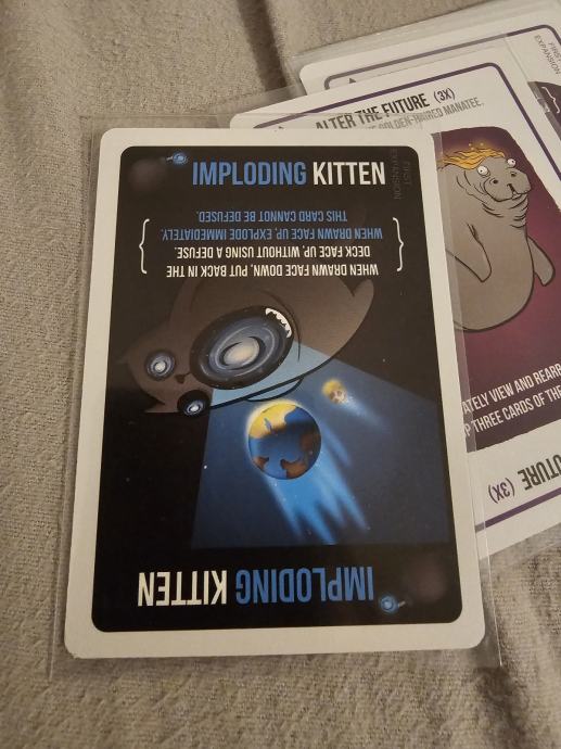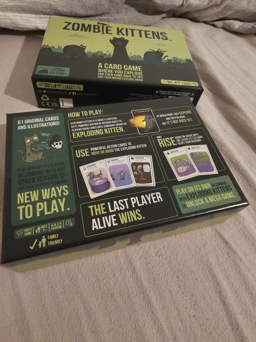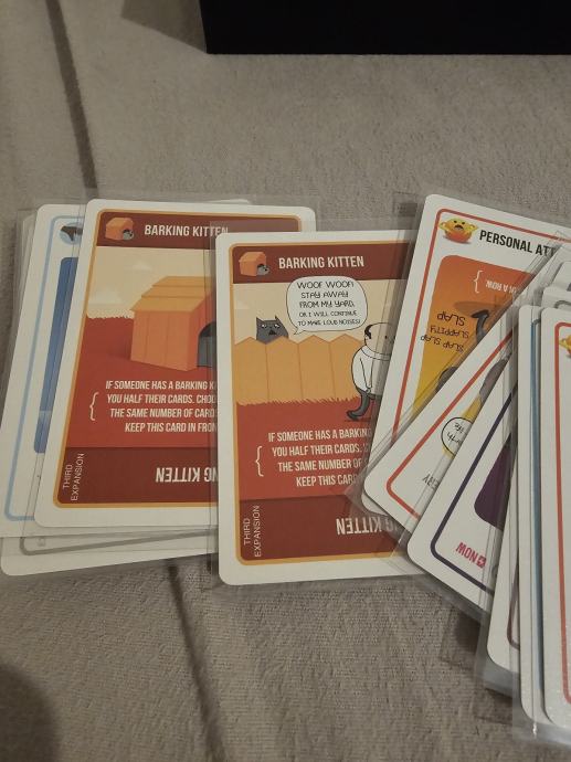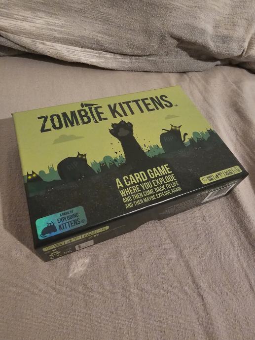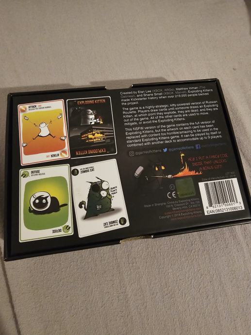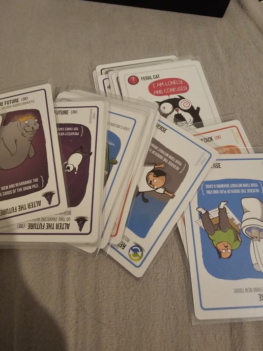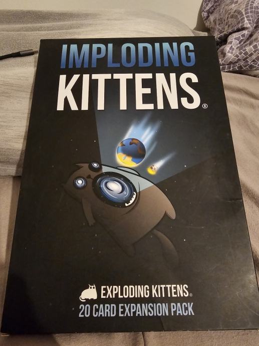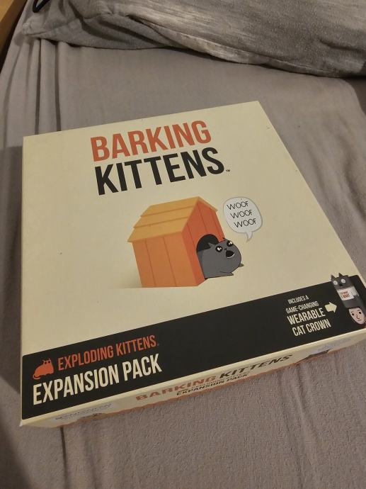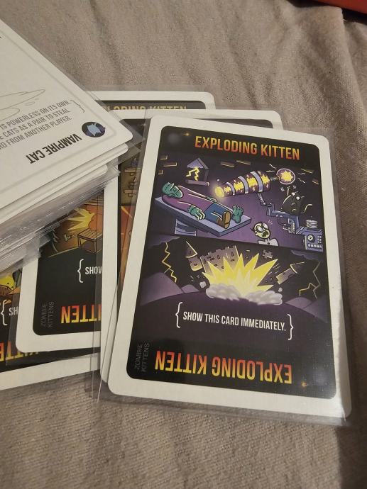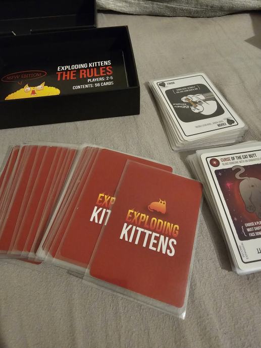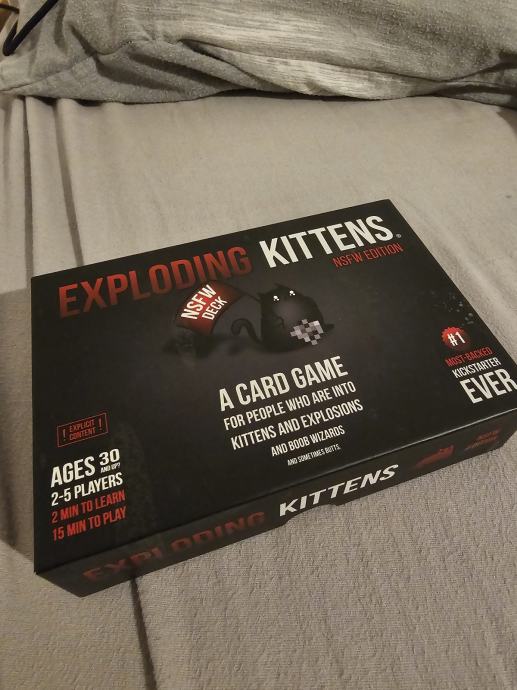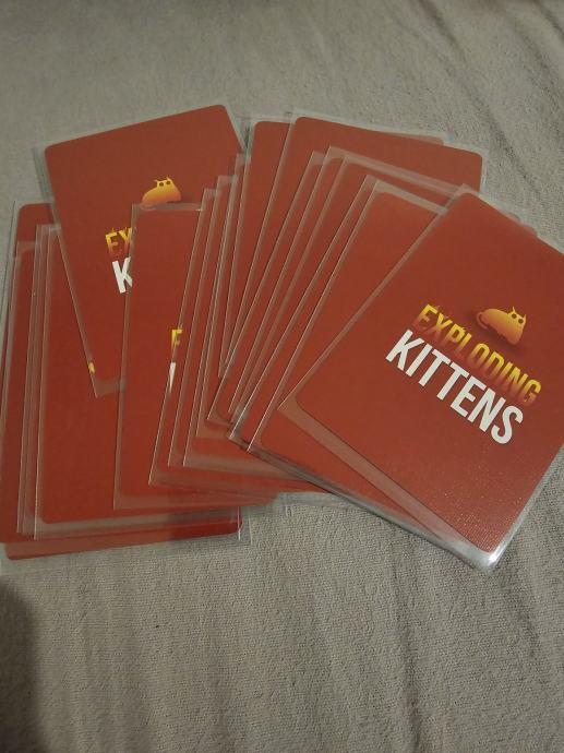 Prodajem komplet iz serije Exploding Kittens. U paketu se nalazi osnovna igra Exploding Kittens u NSFW izdanju, zajedno s dodacima Imploding Kittens, Streaking Kittens, Barking Kittens i Zombie Kittens.